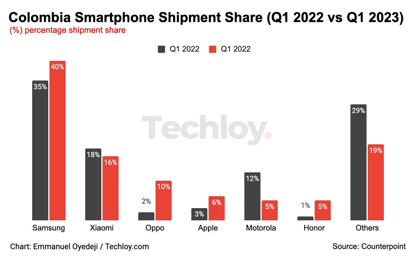 Colombia's smartphone shipments in Q1 2023 fell by 9% YoY, alongside the LATAM region which also dropped by 9% YoY in the same period, marking the lowest quarterly volume since Q1 2020, as reported by Counterpoint Research.