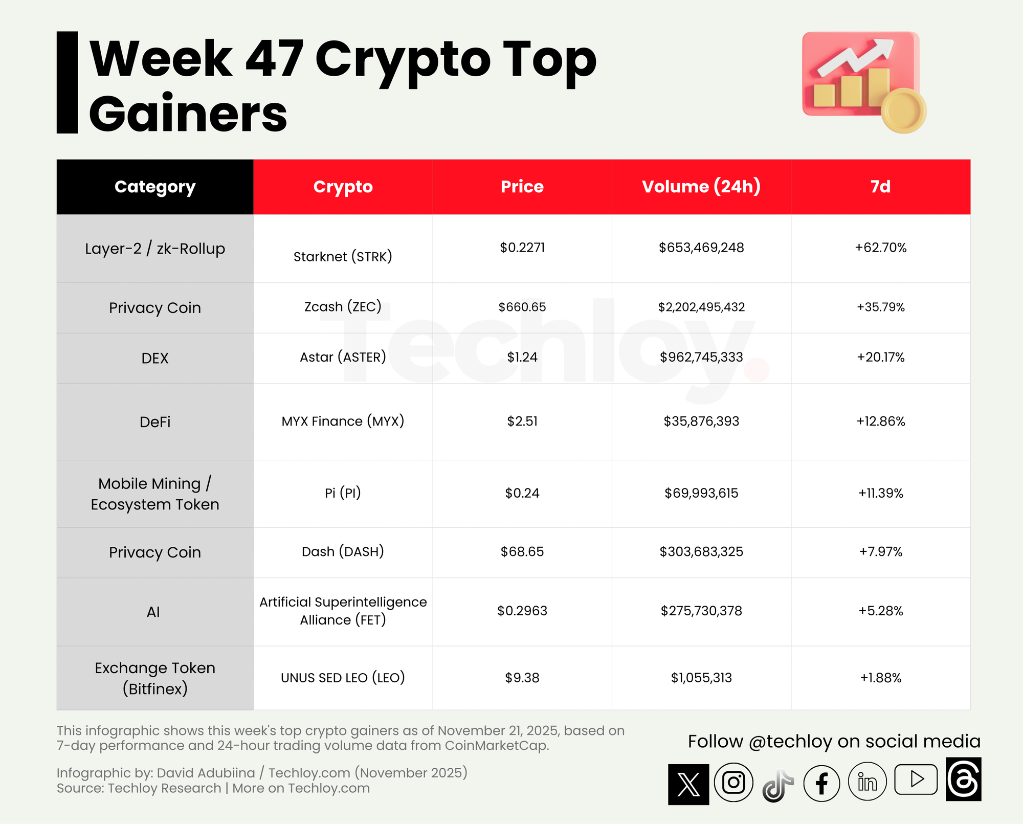 A quick look at the chart and you can get the full picture. Starknet is among the outliers breaking through the noise at about $0.227 after a sharp 62% jump on more than $653 million in weekly volume. Zcash is pushing in the same direction, trading around $660 and up roughly 36%, with more than $2.2 billion moved this week.