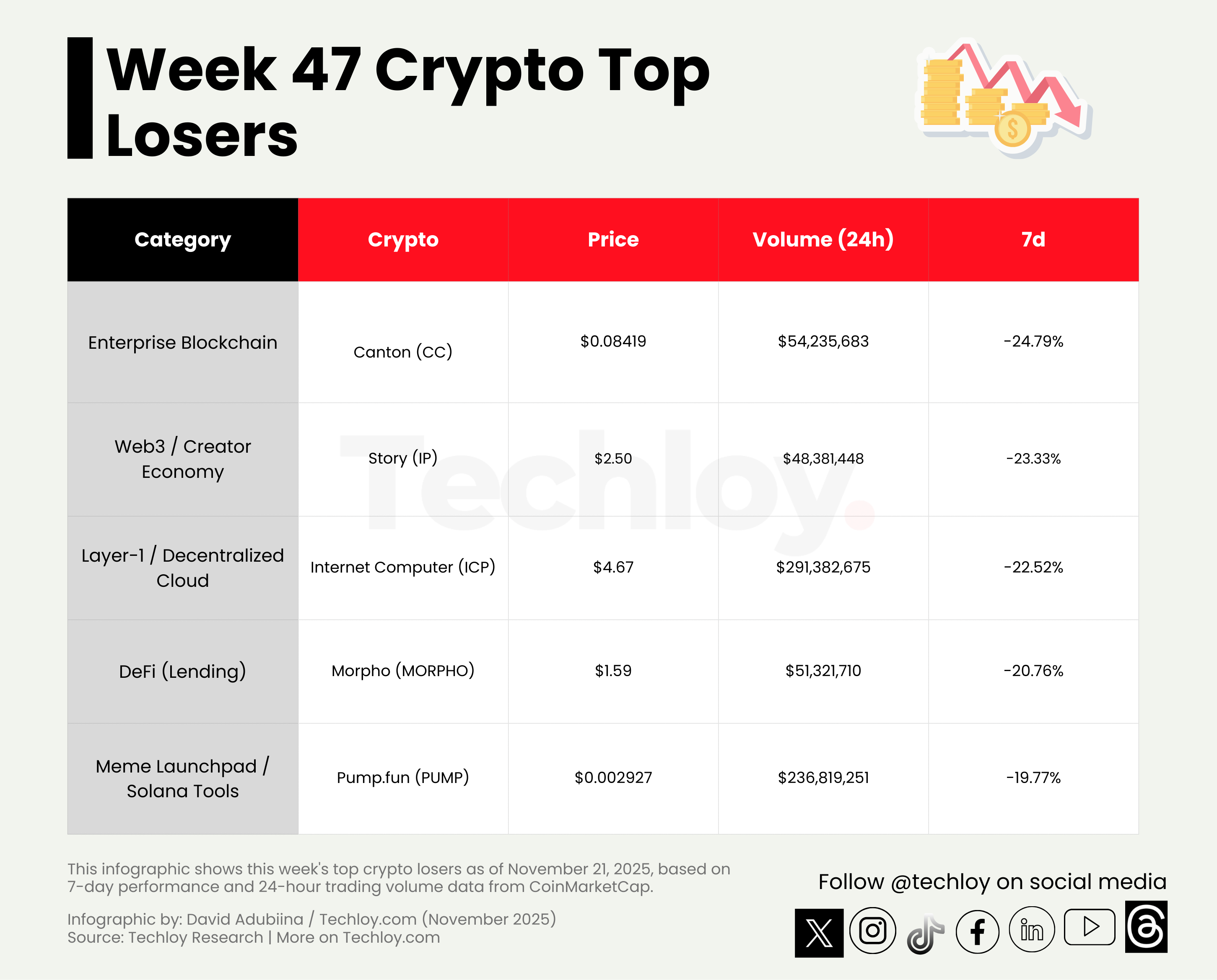 The losses, however, are spread across a much wider part of the market. Canton is down almost 25% and now trades at eight cents, with over $54 million moving through it. Story slipped to $2.50 after a 23% drop, while Internet Computer fell to $4.67, losing more than 22% on nearly $300 million in volume.