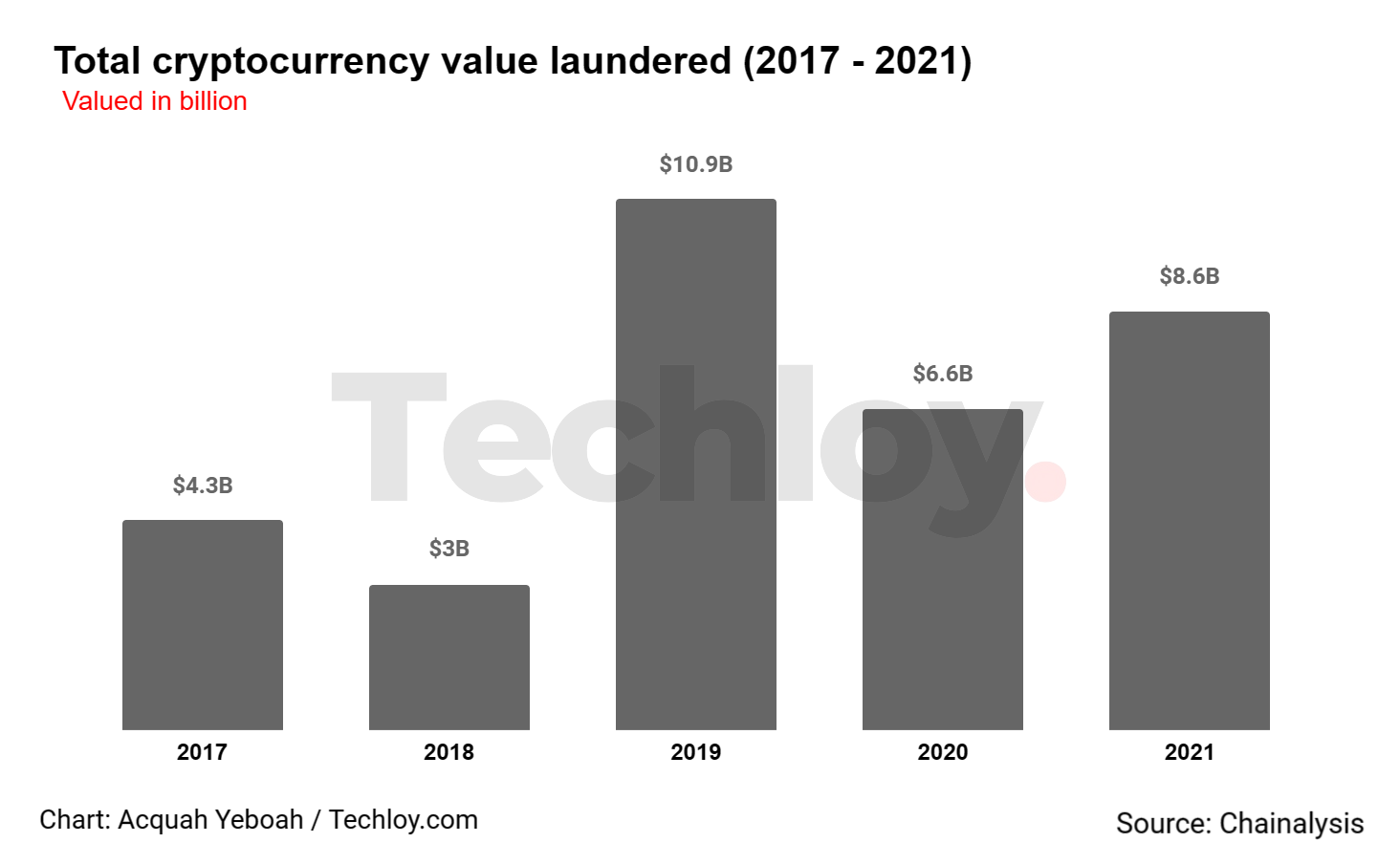 The significant growth of crypto over the years has been marked by a sharp rise in money laundering activities. Â Overall, cybercriminals have laundered over $33 billion worth of cryptocurrency since 2017, with most of the total overtime moving to centralized exchanges.