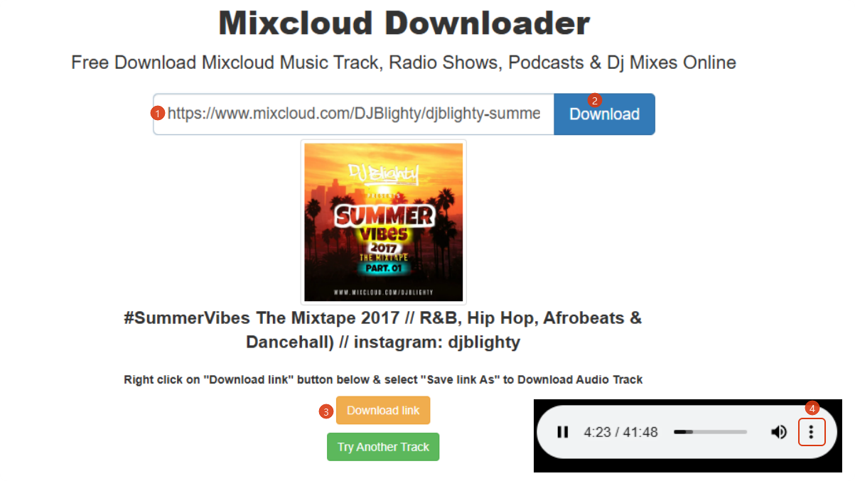 - Head to the online tool mixclouddownloader.net. Paste the link copied into the search bar and click the “Download” button.