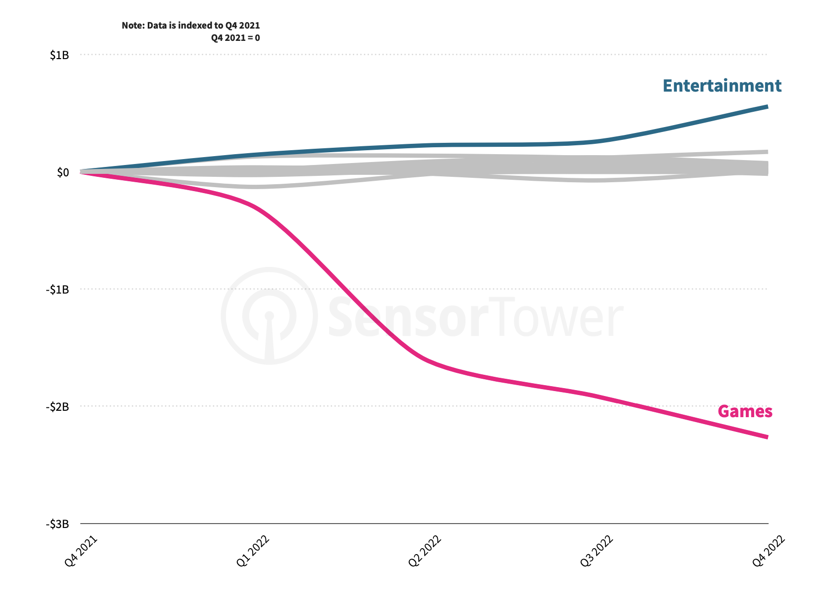 Entertainment app spending has begun to drive global app revenue, recording growth incline as Game spending declined in 2022, per a Sensor Tower report.