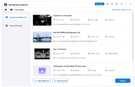 - Repair videos of 18 different formats, including MOV, MP4, MP3, M2TS, MKV, M4V, WMV, MPEG, ASF, etc.