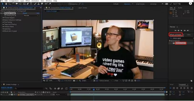 Step 3: After that, go to the Effects & Presets panel, find the "Remove Grain" effect, and drag it onto the video in the composition area to preview the changes.