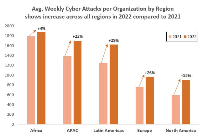 Africa experienced the highest volume of attacks with 1875 weekly attacks per organization, followed by APAC with 1691 weekly attacks per organization. North America (+52%), Latin America (+29%) and Europe (+26%) showed largest increases in cyberattacks in 2022, compared to 2021.