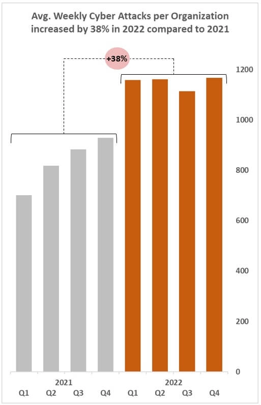 The global volume of cyberattacks also reached an all-time high in Q4 2022, with an average of 1168 weekly attacks per organization.