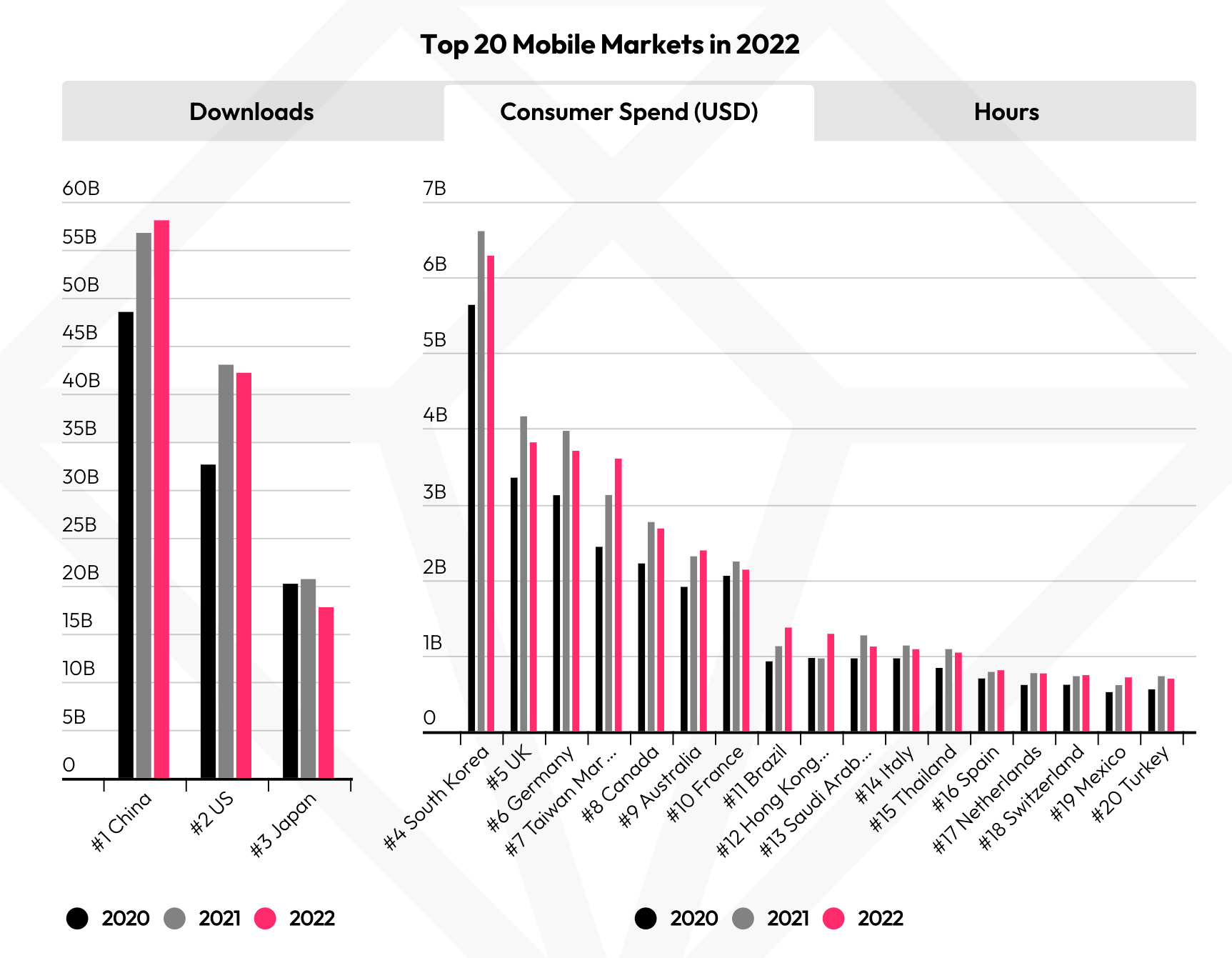 According to the State of Mobile 2023 report, although global consumer spending trended downward in 2022 by -2% YoY, only a handful of markets including China β which led globally β, Taiwan, Brazil, Hong Kong and Mexico bucked this trend at 12%, 15%, 22%, 34% and 17%, respectively. About a third of global spending on mobile games was on titles from China-based companies.
