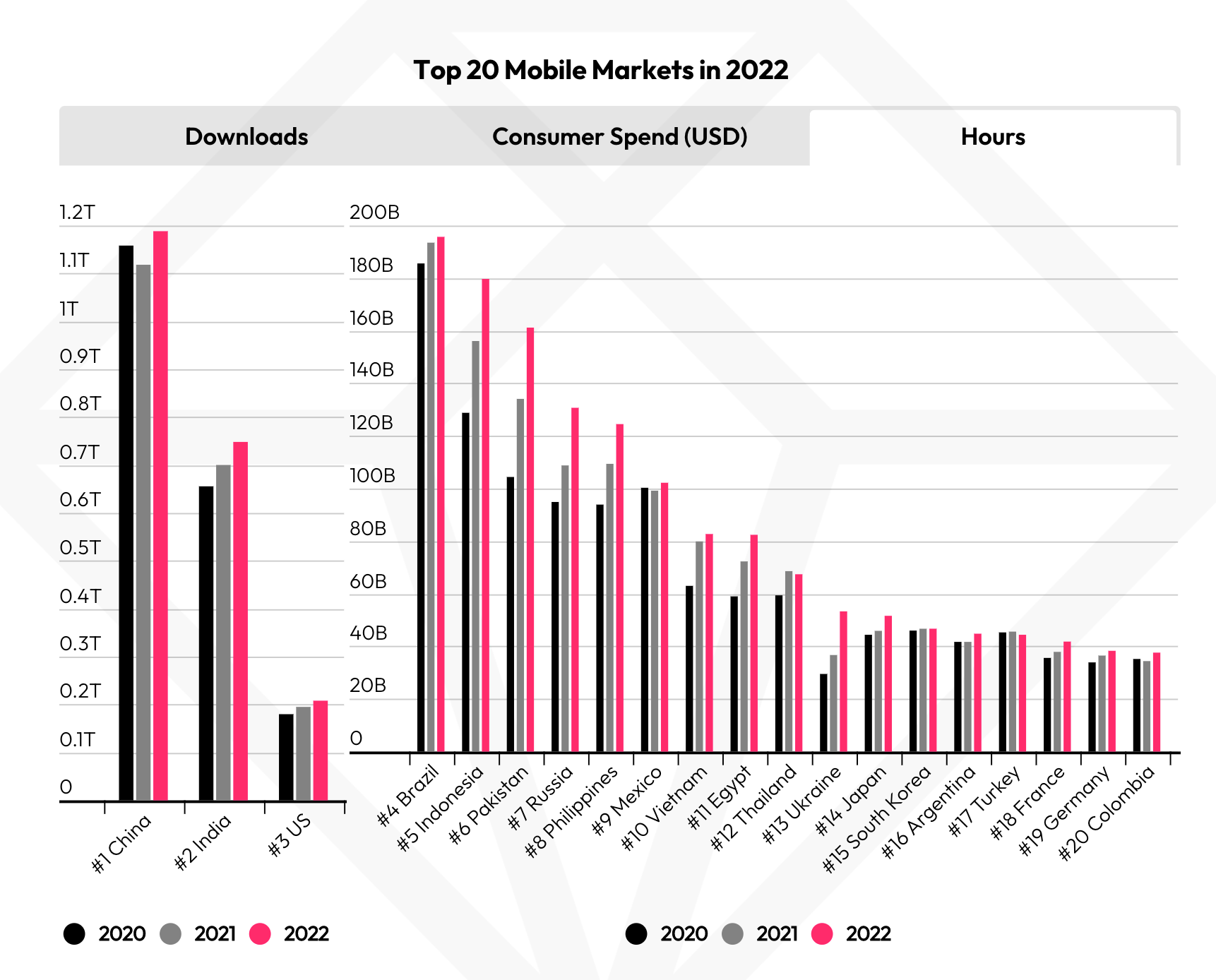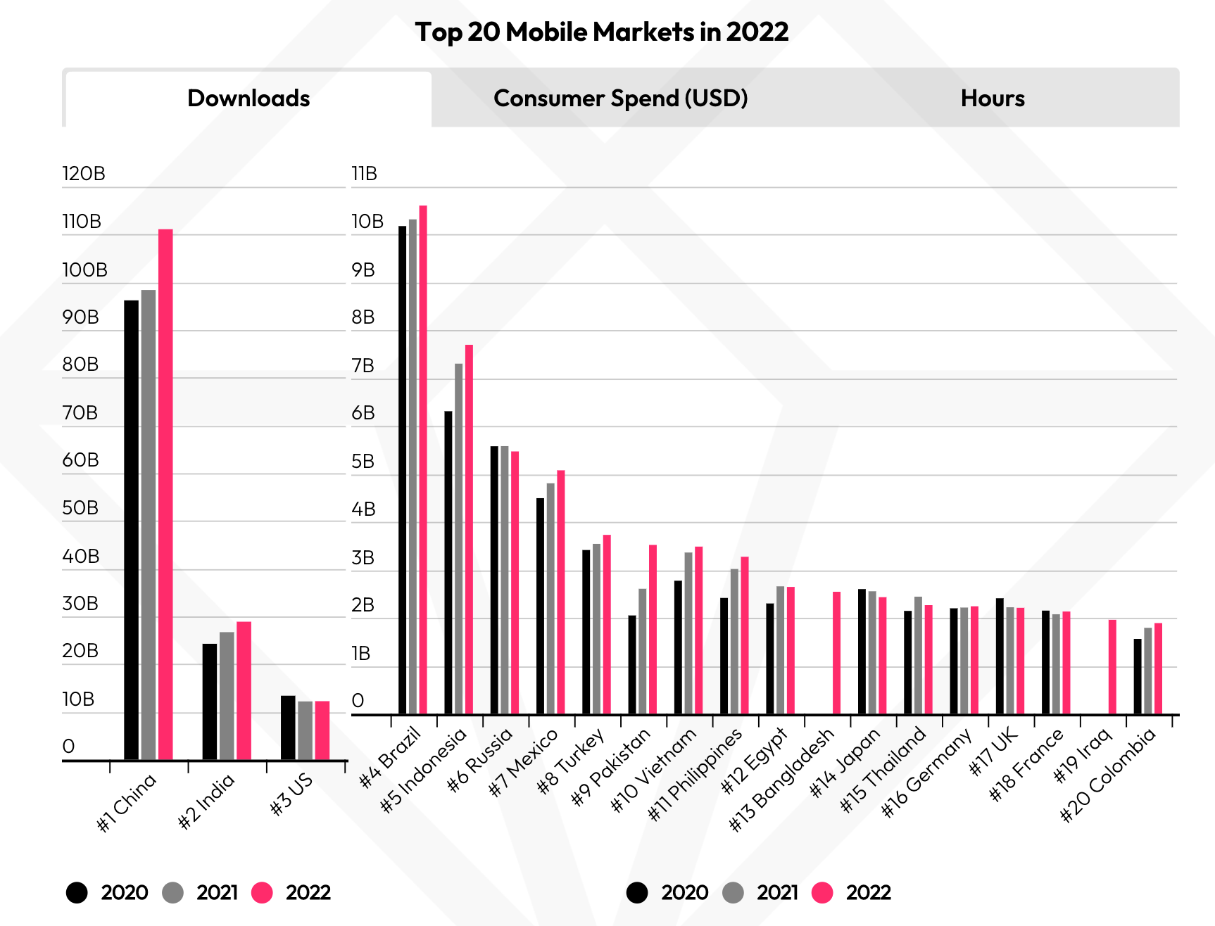 In terms of mobile downloads, China blew other countries out of the water, with over 111 billion in estimated mobile downloads in 2022. India which claimed the second spot was only able to muster just over 28 billion downloads, an incredibly wide margin from China's. Pakistan (#10 largest market) saw standout growth at 35%.