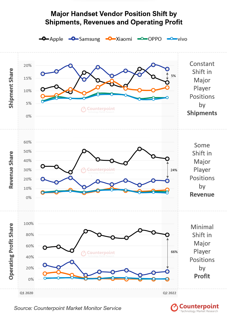 OPPO, Vivo, and Xiaomi saw double-digit YoY declines in their smartphone revenues, according to Counterpoint.