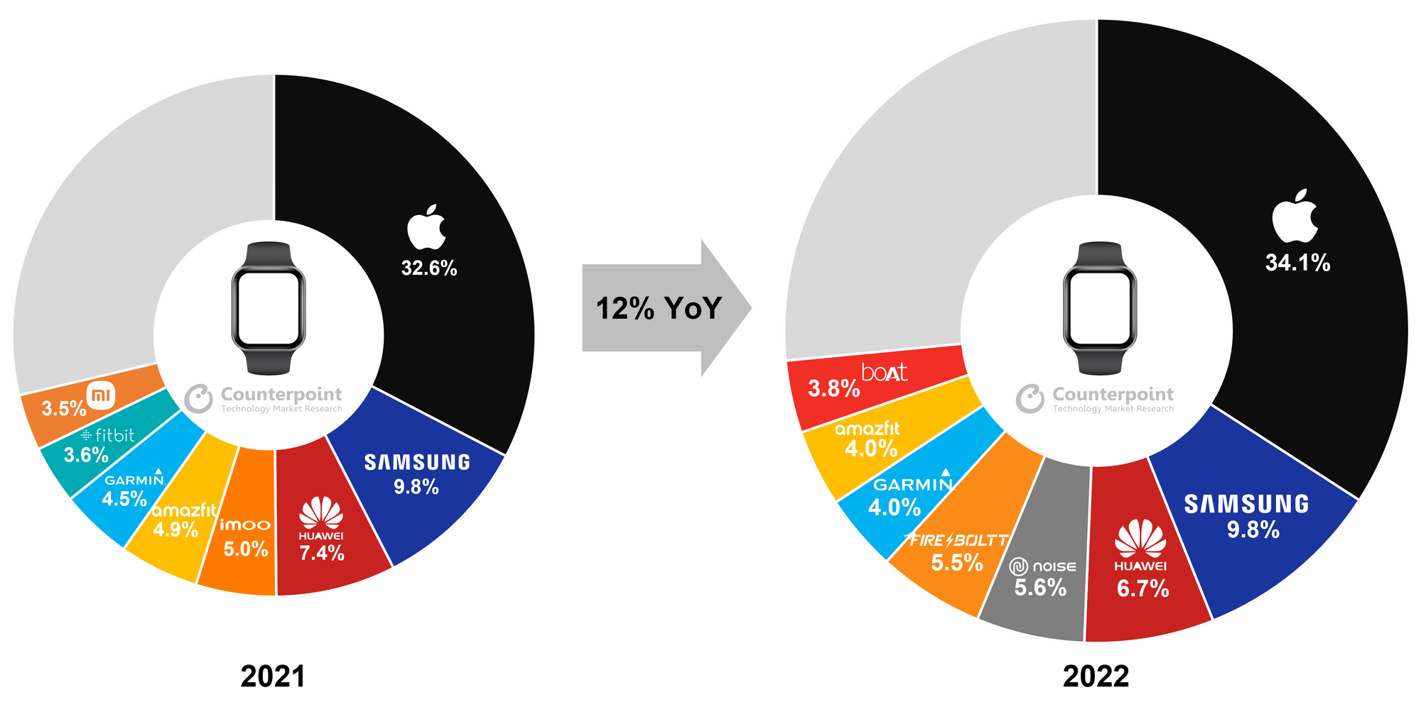 Global smartwatch market shipments marked a 12% YoY in 2022 due to the strong YoY growth witnessed in the first three quarters of the year but slowed down in the fourth quarter of 2022 amid inflationary pressures and slow growth in India, according to recent research published by Counterpoint.