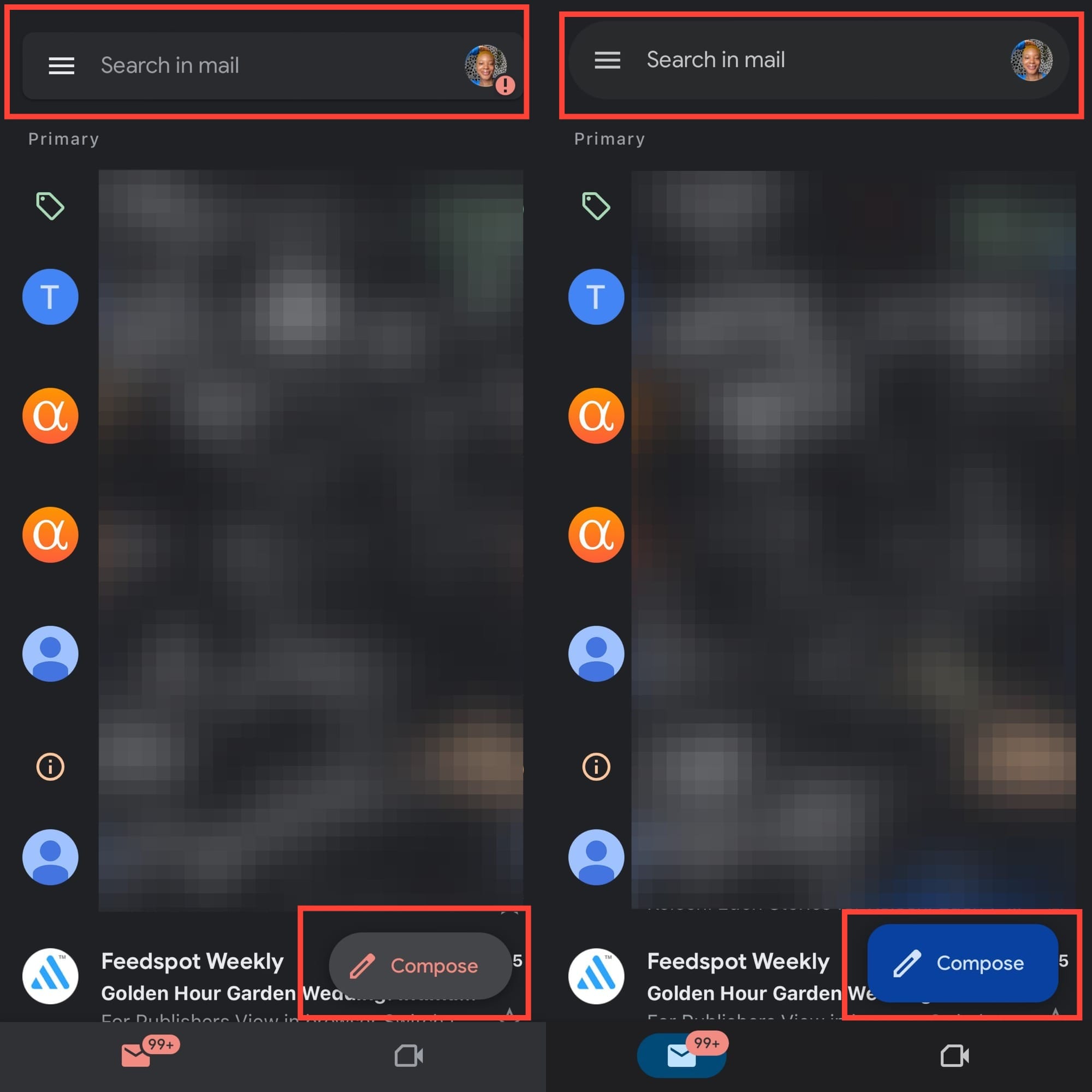 The "Compose" button also gets a makeover, now a rounded rectangle, while blue becomes the new accent color, stepping away from Gmail’s classic red. Inside emails, smaller tweaks like a horizontal three-dot menu may add to the cleaner, more consistent feel.