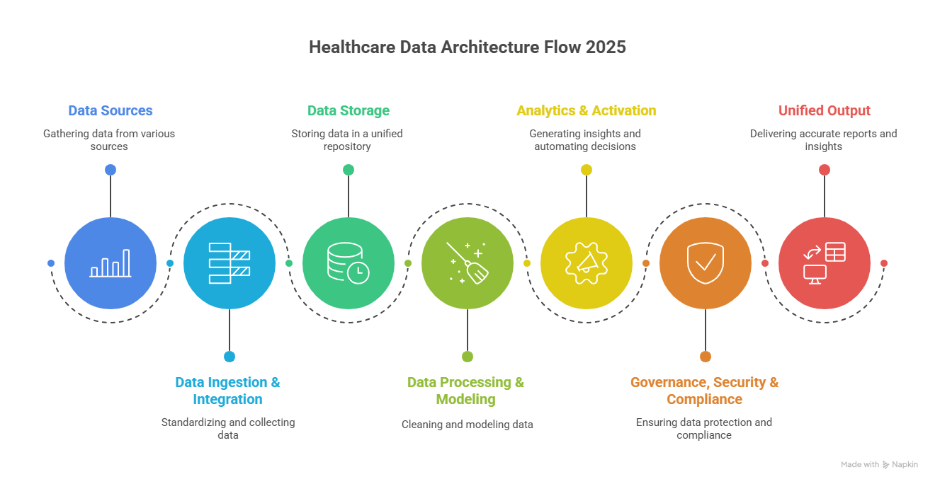 A 2025-ready healthcare data architecture functions as a connected system of layers, each with a defined purpose. Together, these layers transform raw data into insight that teams can rely on.