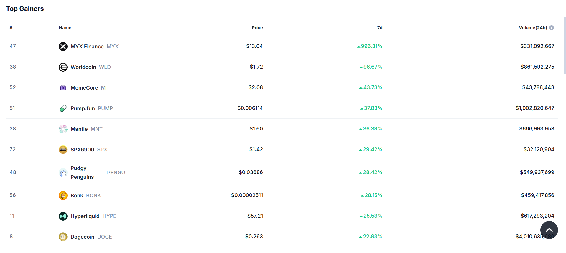 Then you’ve got MemeCore climbing 46.8%, Pump.fun soaring 42.1%, and Mantle adding another 38.2% to its price. Even lesser-known names like SPX6900 with a 28.4% rise, Bonk up 26.8%, and Pudgy Penguins tacking on 26.4% had their moment. Meanwhile, Hyperliquid pushed 25.7% higher, and Dogecoin closed the list with a solid 22.6% weekly gain.