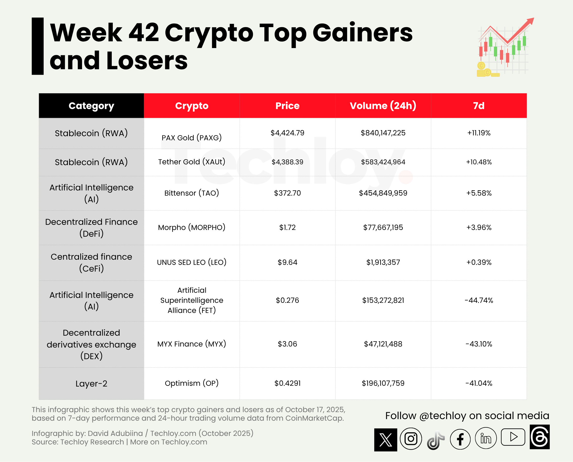 Looking back, Week 42 portrays a market split between safety and speculation. Gold-backed tokens had their moment, while high-risk bets get riskier. Maybe this was crypto’s version of Black Friday after all, but not the kind where you fill your cart. This one was about holding on to what’s left, riding out the chaos, and hoping the worst was behind you.