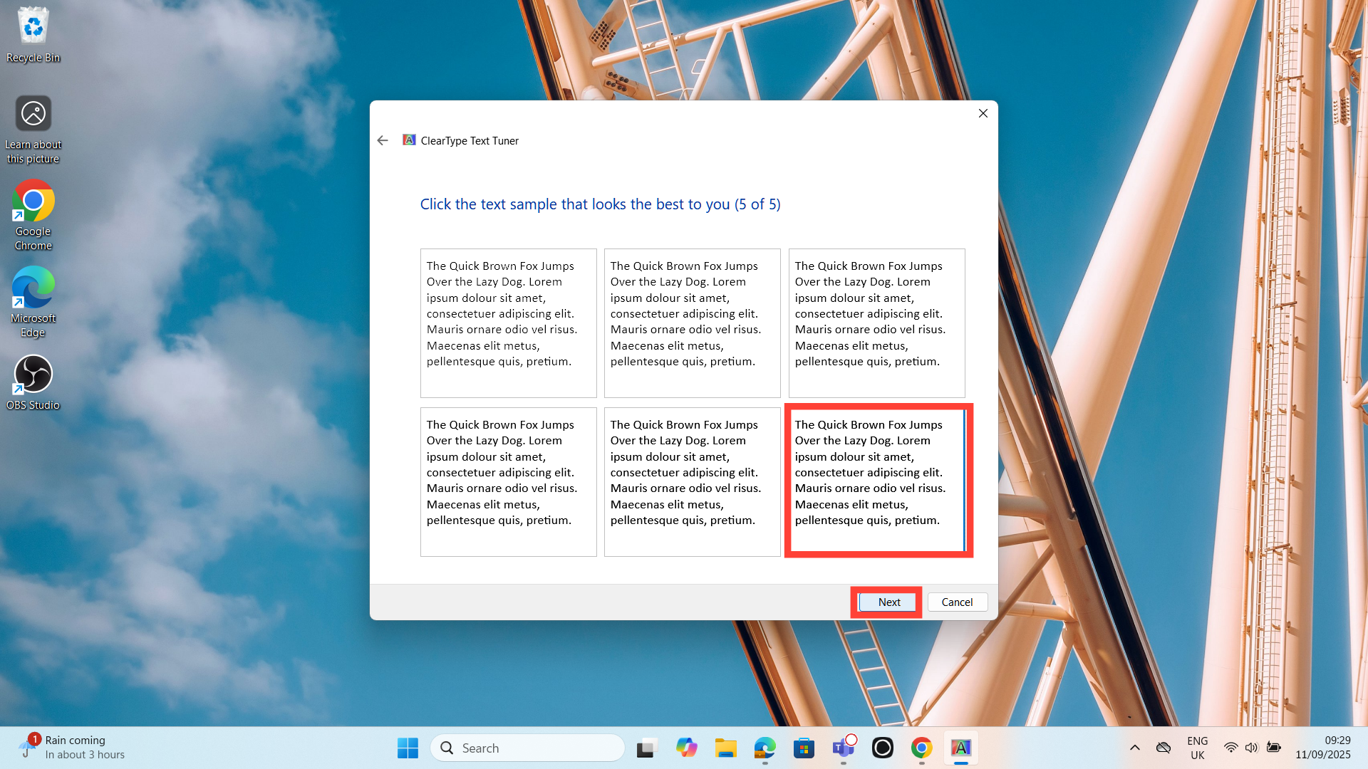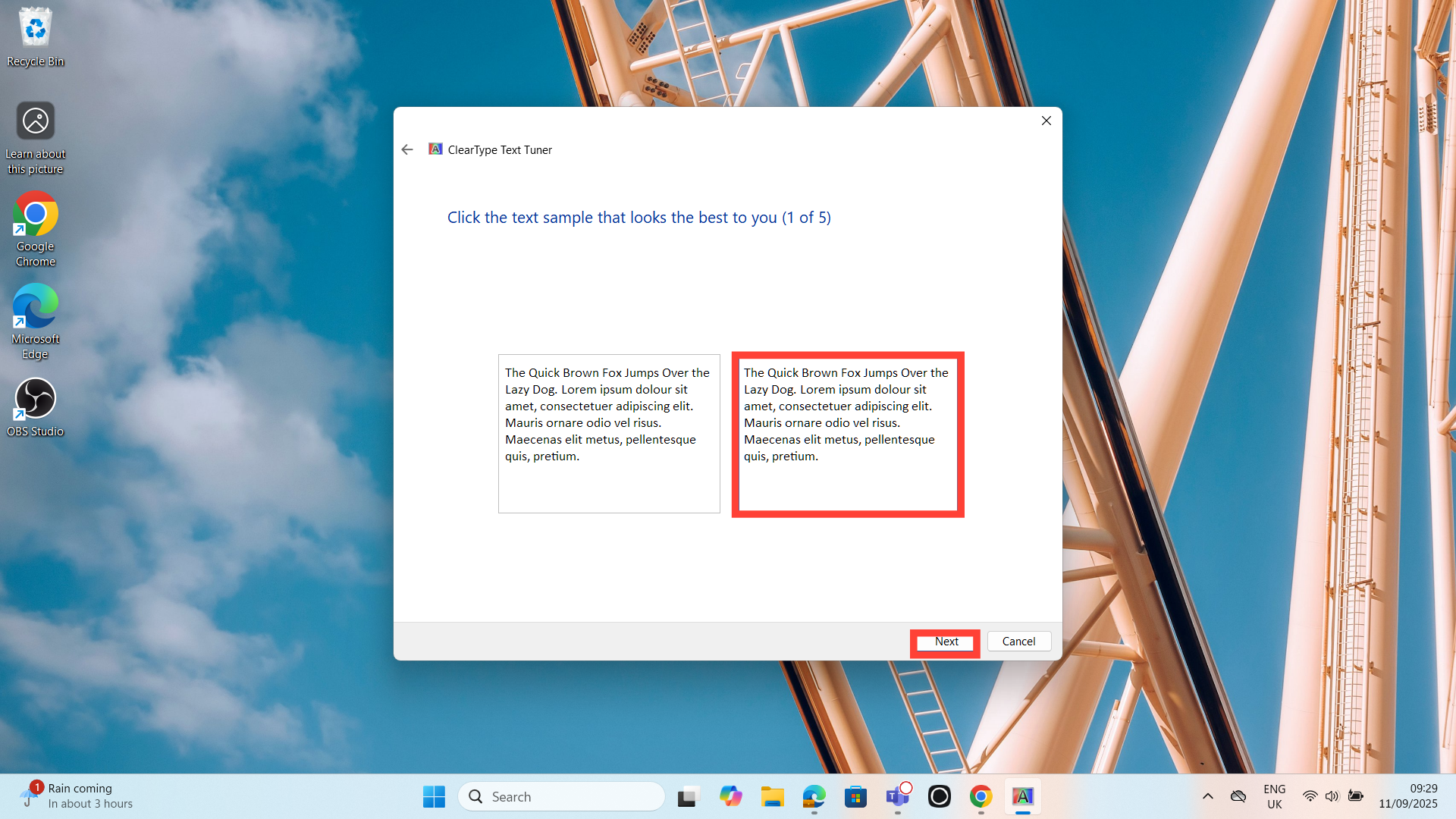 Step 3. Click "Next" to begin. Windows will display a few text samples; just choose the one that looks sharpest and easiest for you to read and tap "Next".