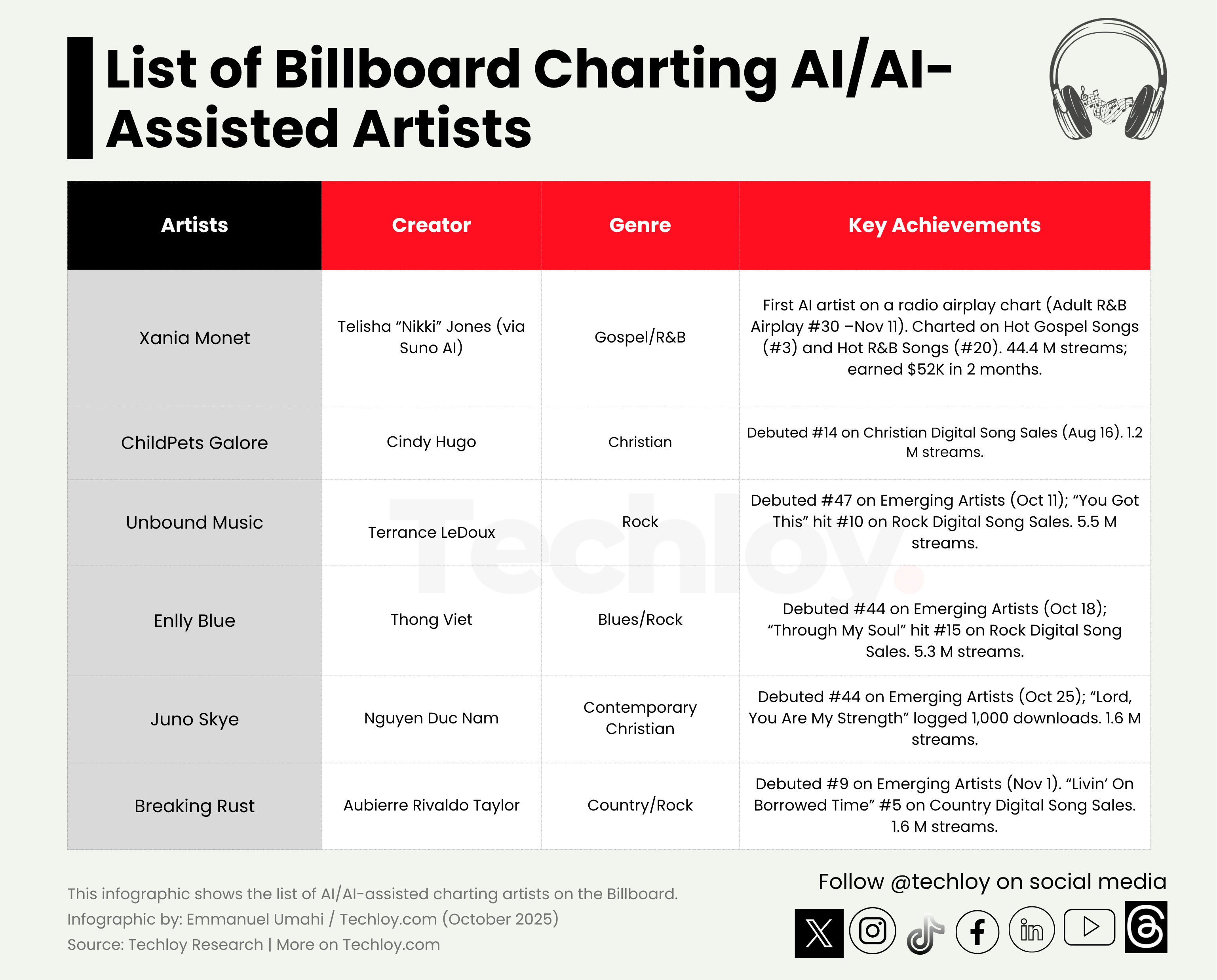 The story of AI music’s rise on Billboard is best told through its most visible figure: Xania Monet. Created by Mississippi-based songwriter Telisha “Nikki” Jones using the AI platform Suno, Monet is part avatar, part vocalist, and all sensation. Her single Let Go, Let Go climbed to No. 3 on Hot Gospel Songs, while How Was I Supposed to Know? peaked at No. 20 on Hot R&B Songs.