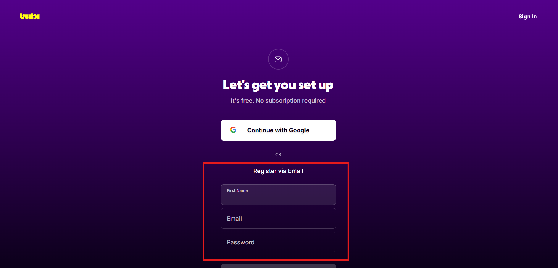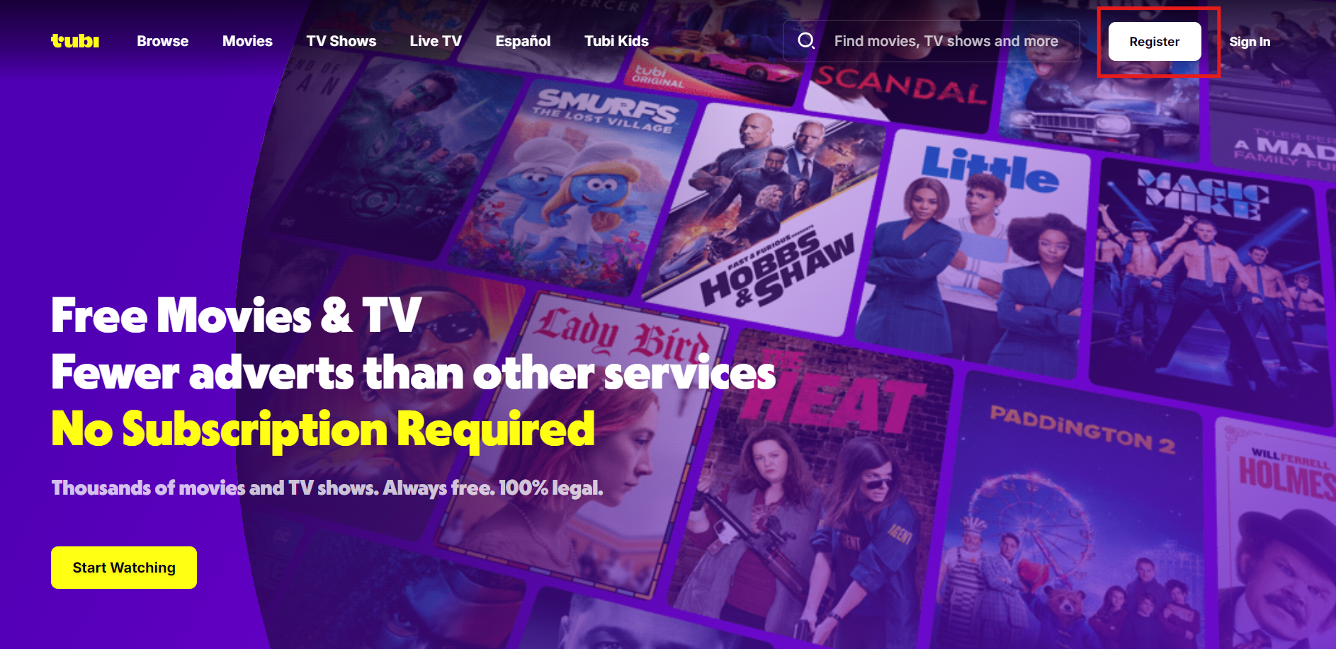 Step 1: To access Tubi, you must create an account first. To do this, simply visit the Tubi website, and click the "Register" button at the top right corner to sign up for an account.