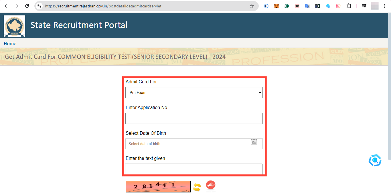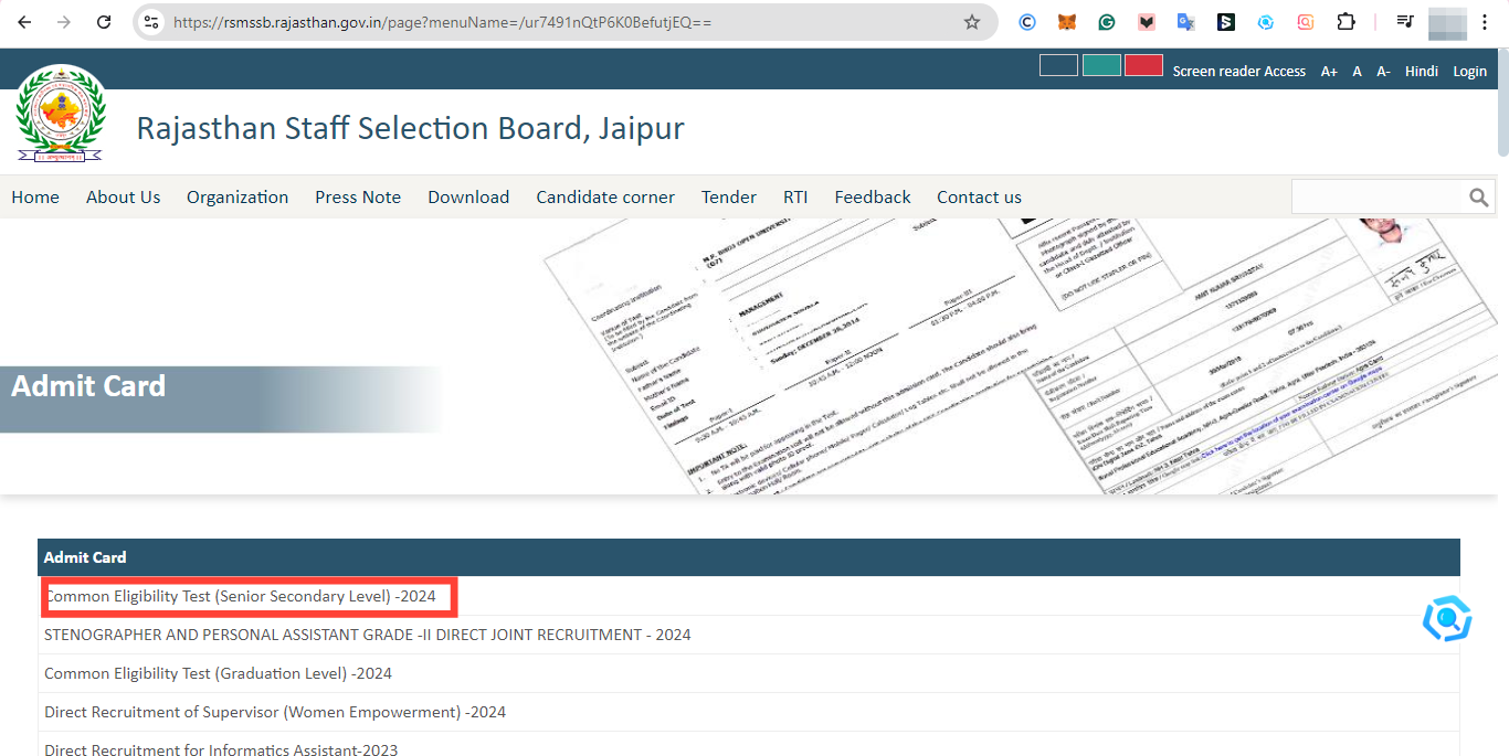 Step 3. Once opened, select “Common Eligibility Test (12th Level) 2024” under the Admit card tab.