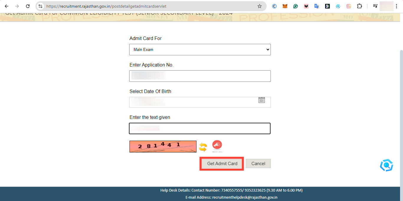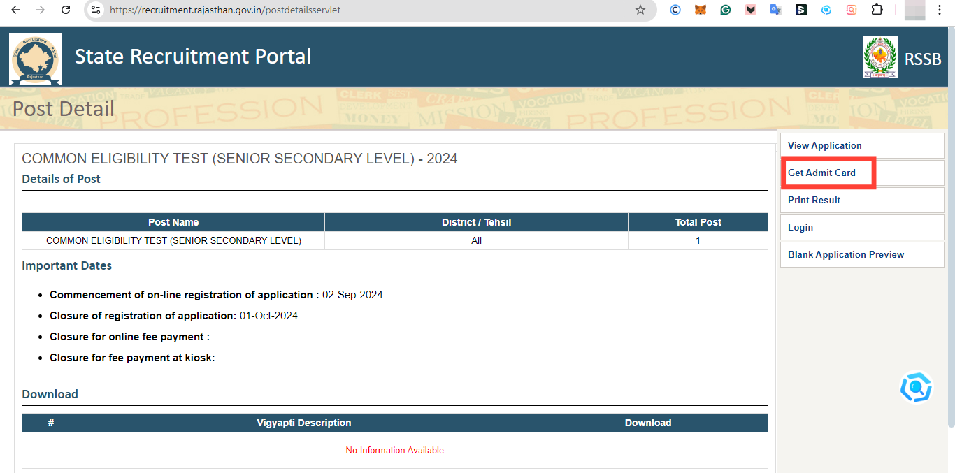 Step 6. Scroll down and tap "Get Admit Card". This will allow you to download your RSMSSB CET 12th Level Admit Card 2024 and keep it for future reference.