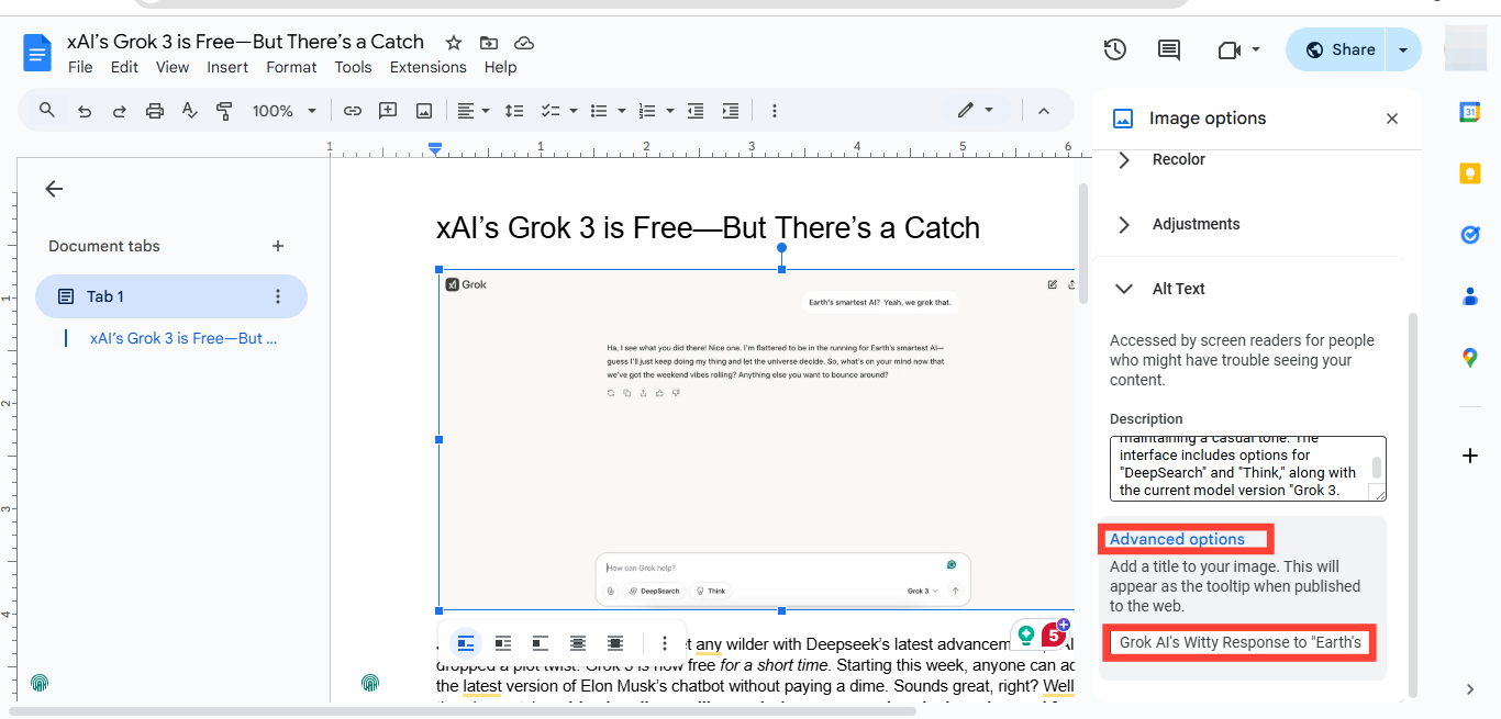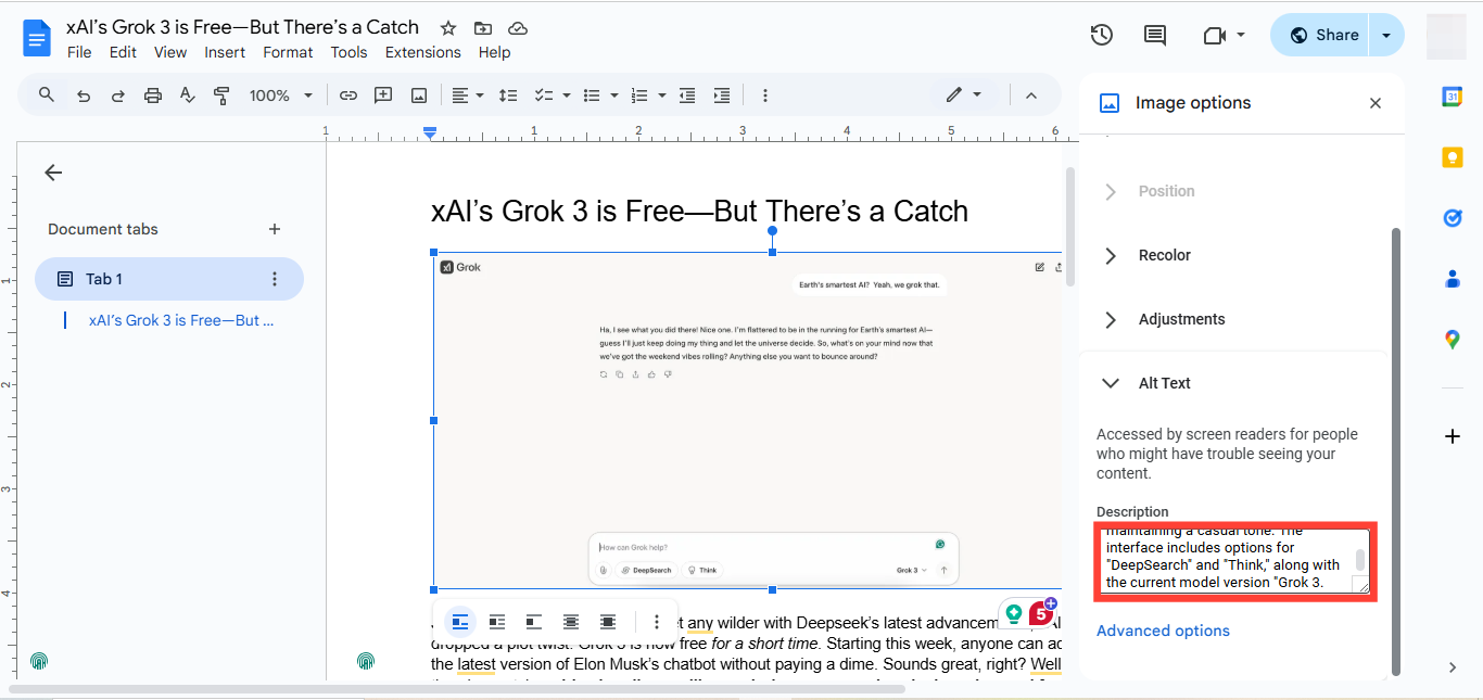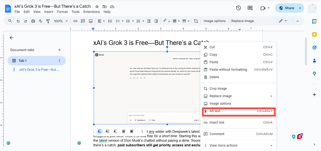 - If you're working in Google Docs, adding alt text is pretty simple. Here’s what you need to do: