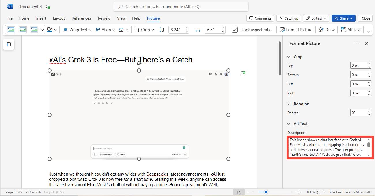 Step 4. A sidebar will appear where you can enter a description of the image. Word normally generates an automatic description for most images, but it's always best to customize it for accuracy.
