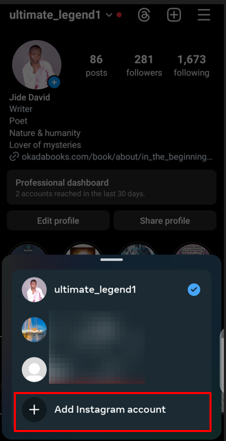 - From your profile page, tap the dropdown arrow in the top right corner. You'll see a list of all the accounts you've added. Tap on the desired account to switch.