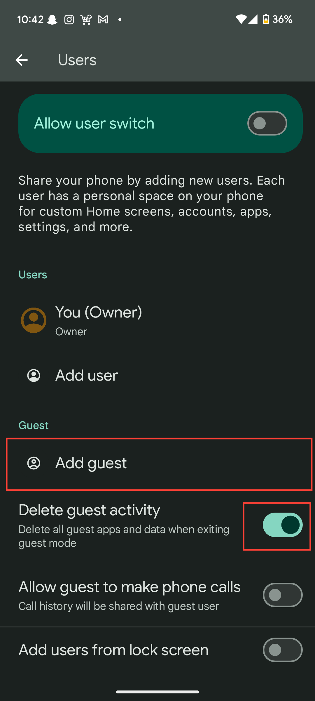 - For additional security, toggle on the Delete guest activity to erase all data used and received in the guest session.