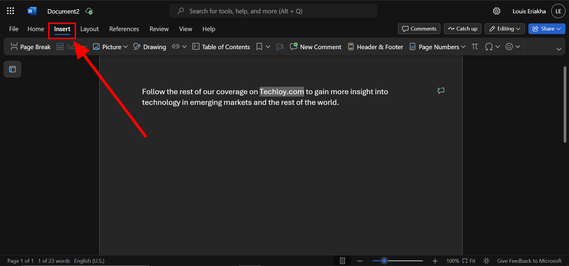 Step 1: Highlight the text you want to link. In this, the text "Techloy.com" is highlighted