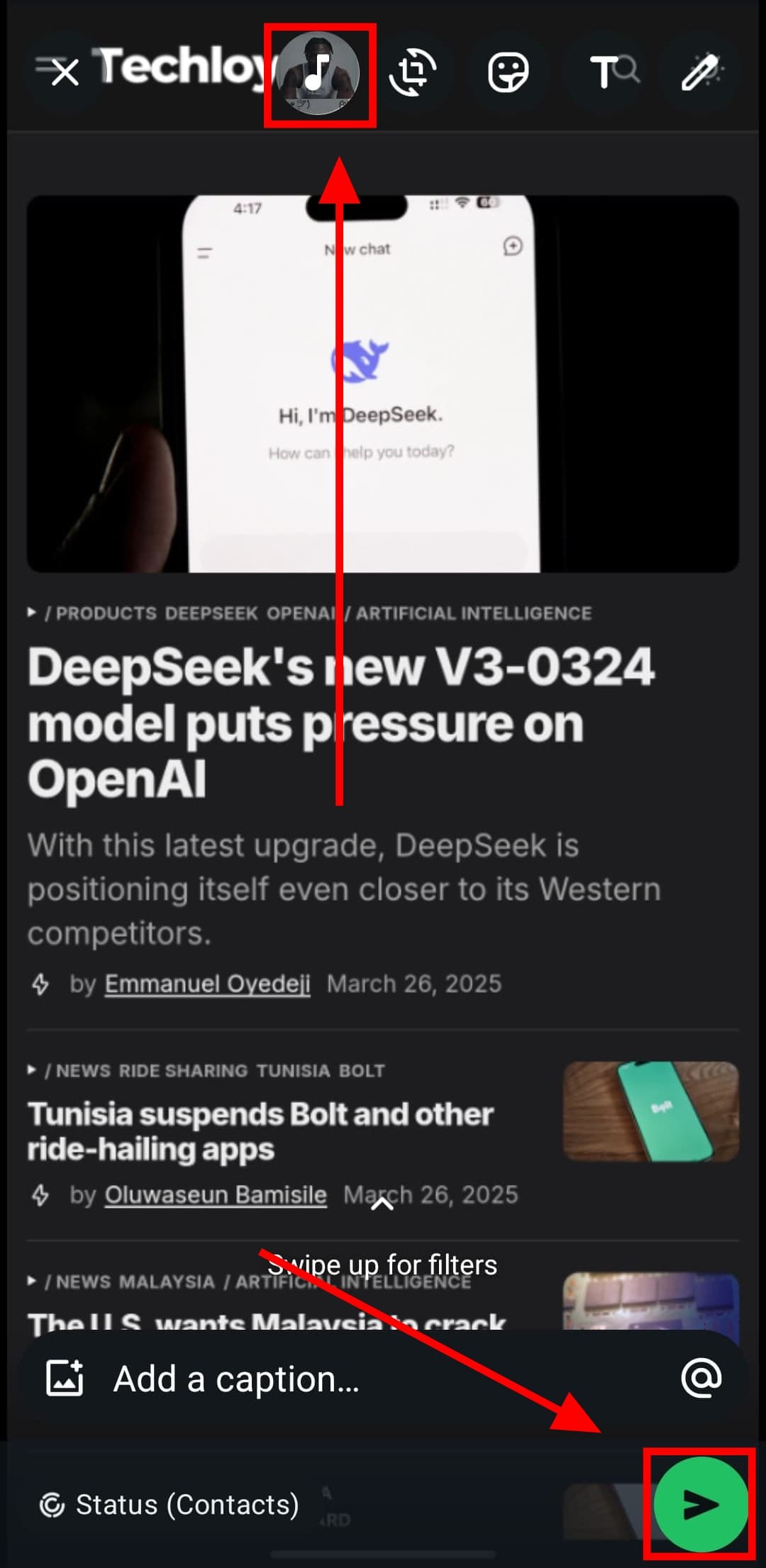 Step 7: Check the sound icon to confirm your song choice. If it looks right, hit the Send button at the bottom right
