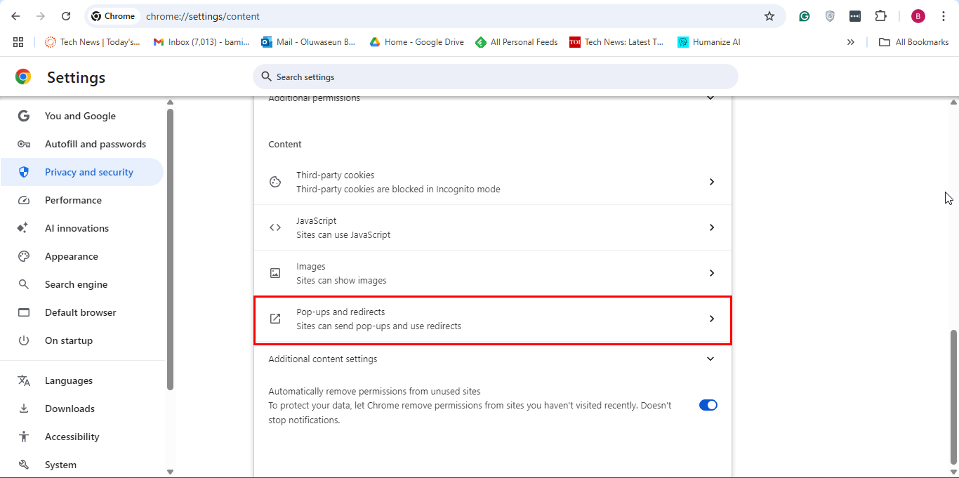 Step 5: Under the Content section, select "Pop-ups and redirects"