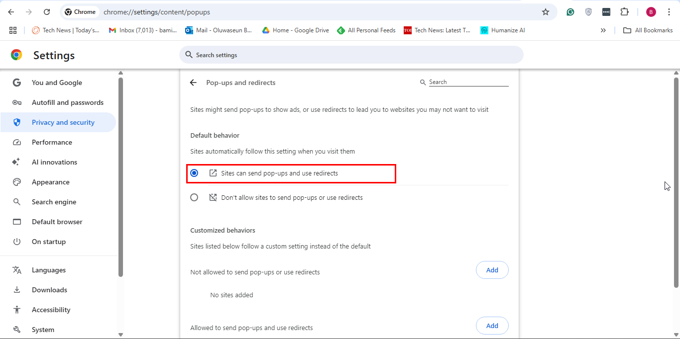 Step 6: Finally, select "Sites can send pop-ups and use redirects". Now, every site you open on your Chrome browser will be able to use pop-ups and redirects