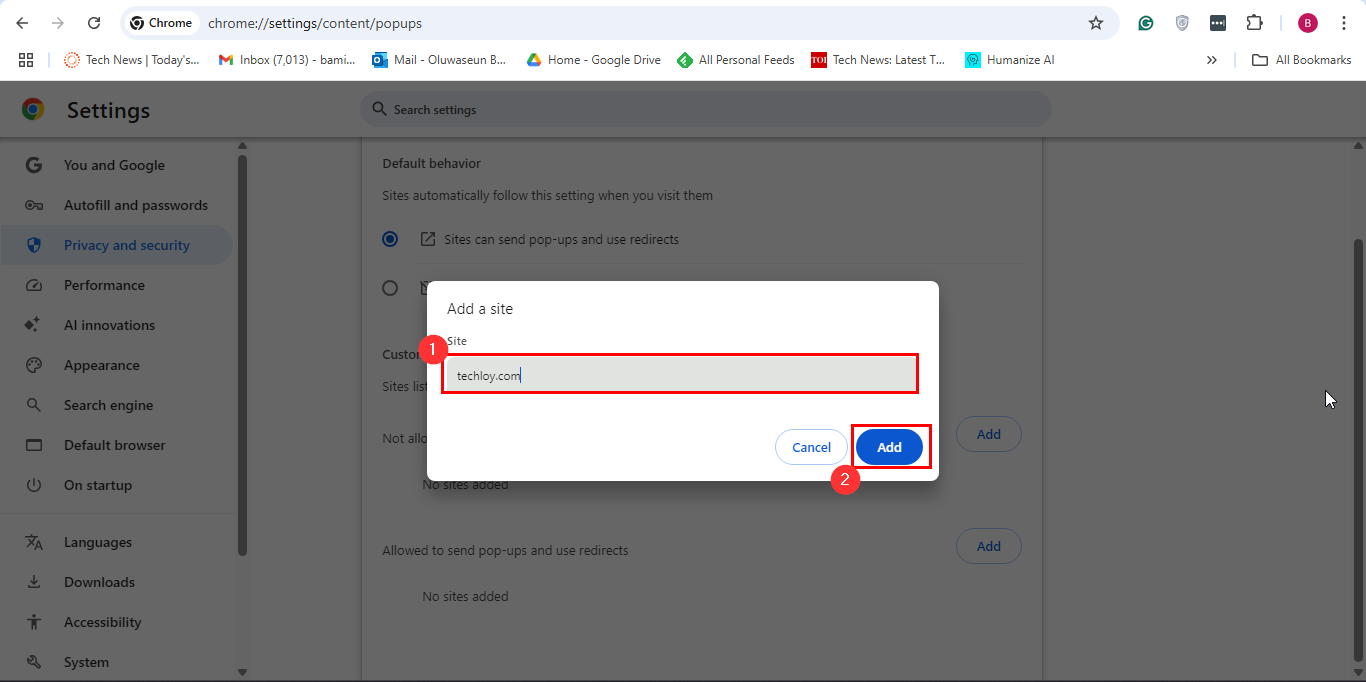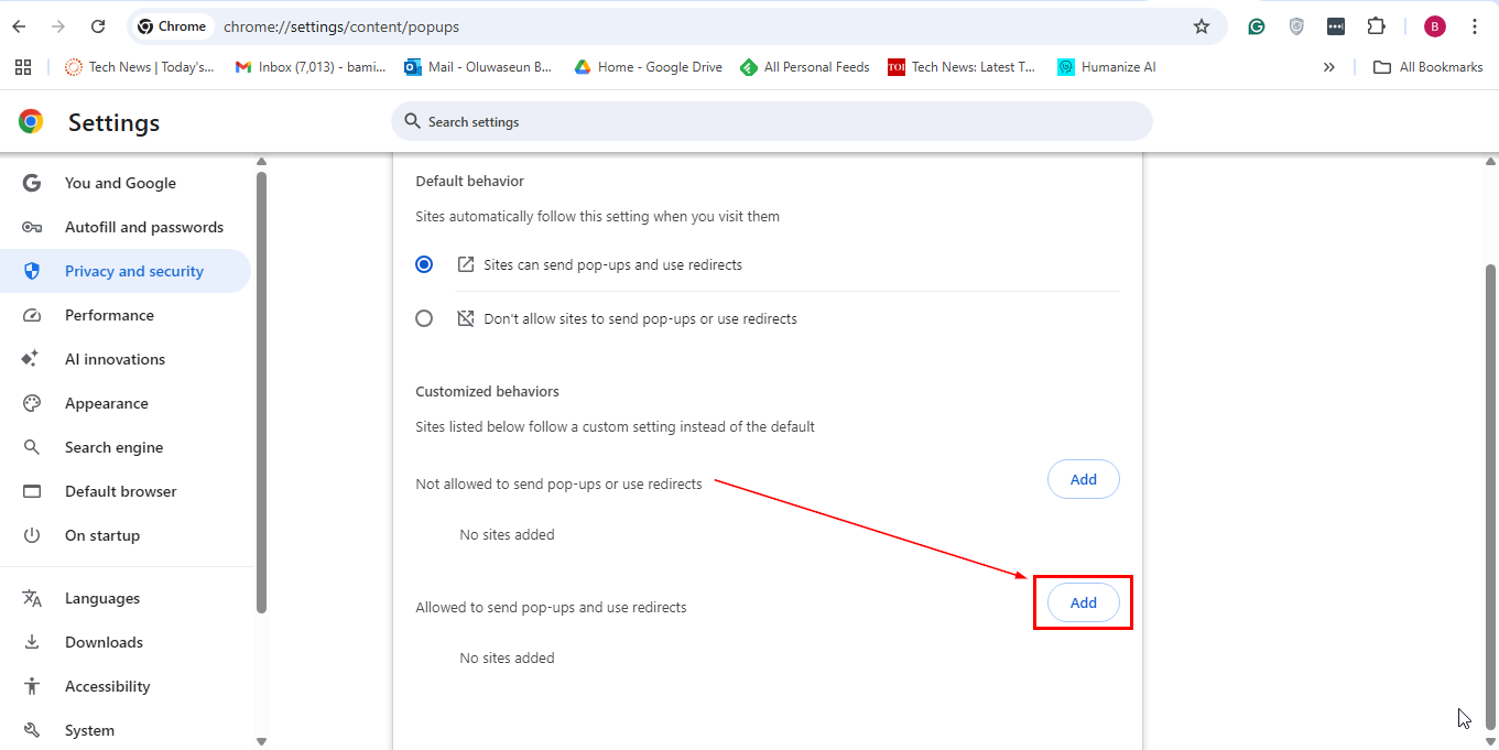 Step 2: Under the Customized behaviors section, select "Add" beside the "Allowed to send pop-ups and use redirects" option