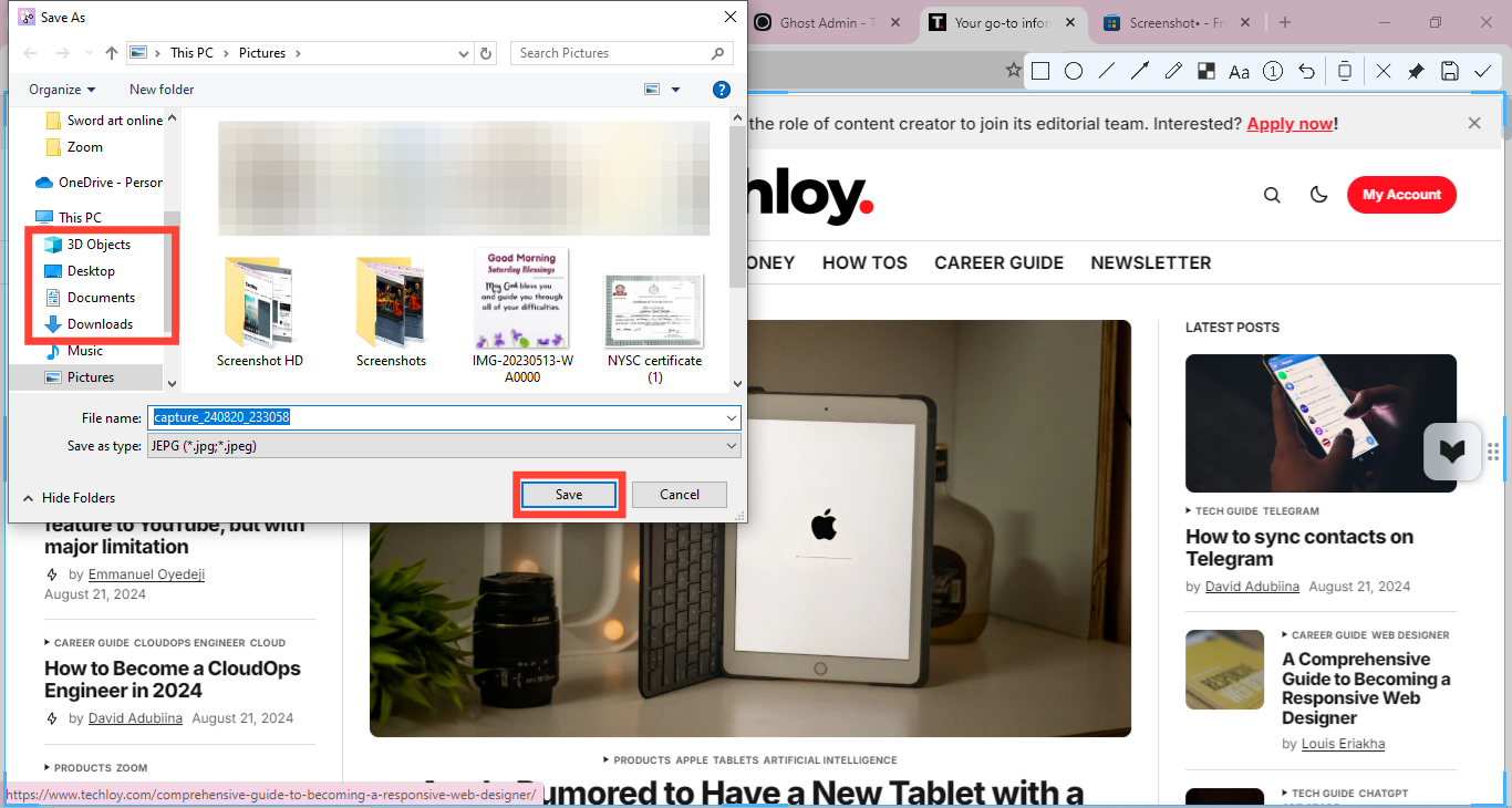 After you've clicked the "Save" icon, select the destination for the image on your PC where you can easily access it later.
