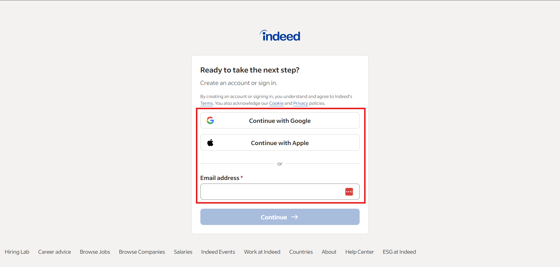 Go to Indeed's homepage, click on the "Sign In" button at the top right corner, and then choose to continue with your Google account, Apple ID, or email address.