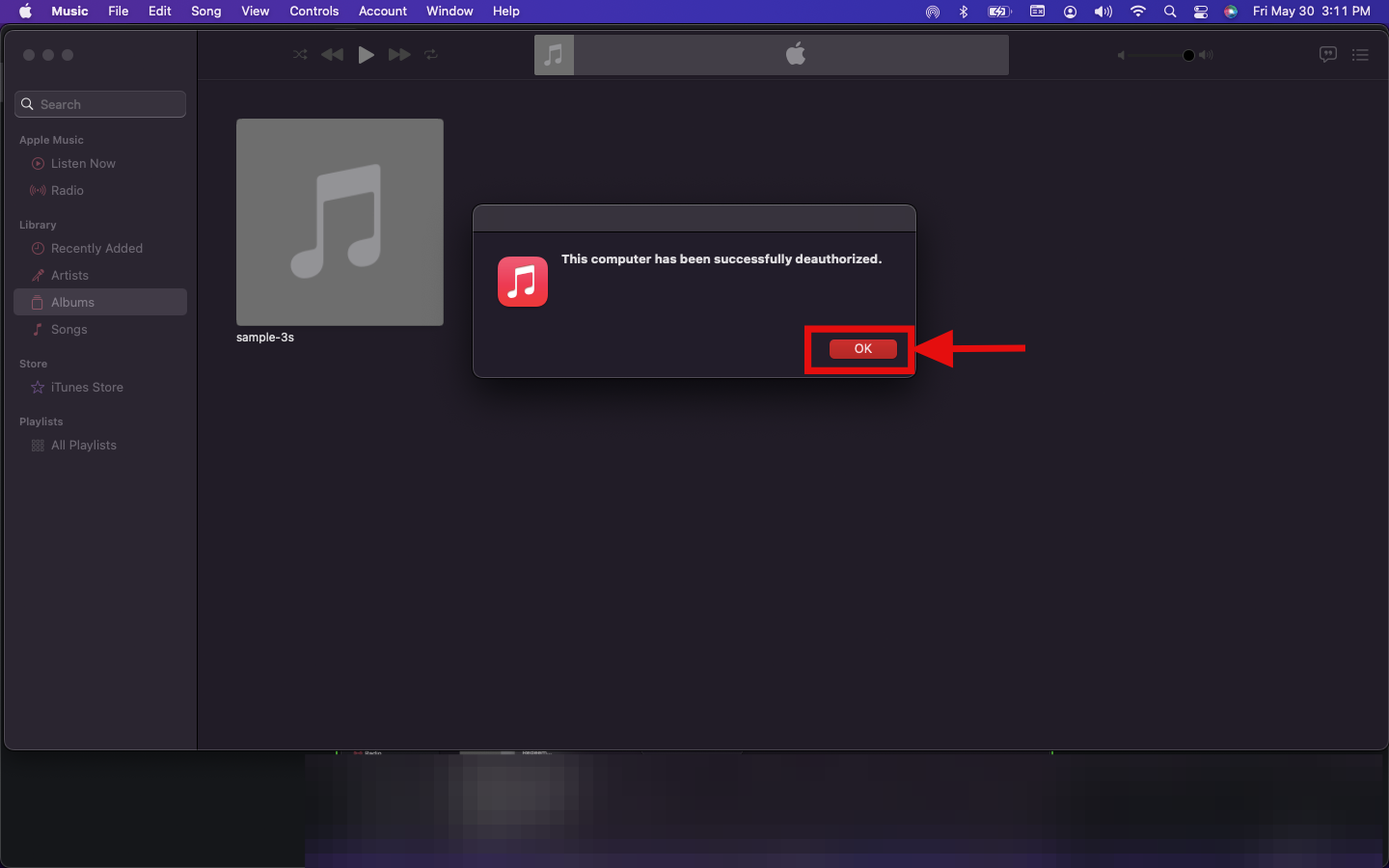 Step 8: You'll be prompted on your screen that your computer has been successfully be deauthorized then you can click on Ok