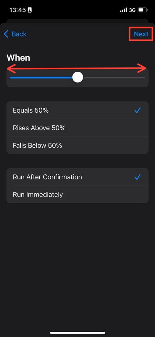 Step 5: Drag the slider to adjust the percentage level for when Low Power Mode should be activated (the prompt is normally triggered when the battery equals 20%, but I'll set mine to 50%). Tap Next when you're done.