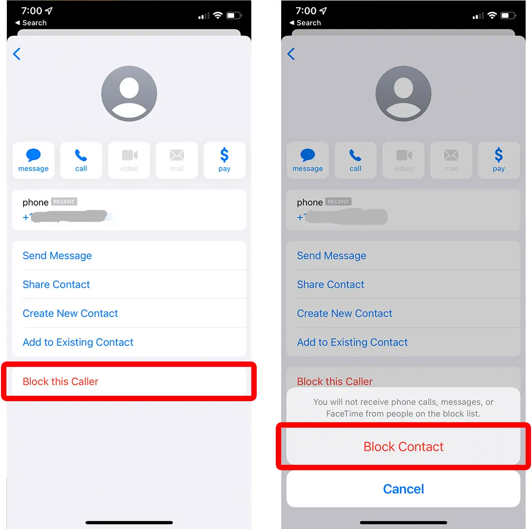 6. Finally, tap Block Contact from the pop-up menu.