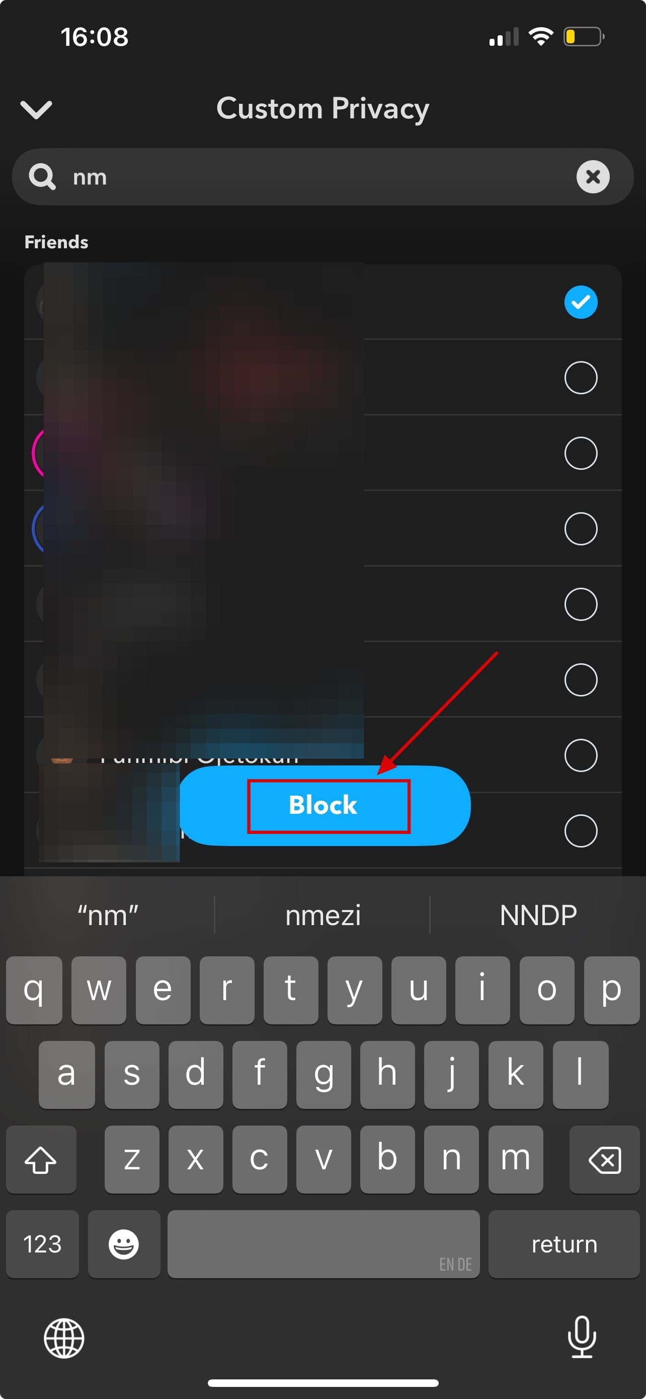 Step 5: Select the friend or friends you want to block from viewing your Snap story, then click "Block." This automatically blocks the friend/friends you have selected from seeing your story