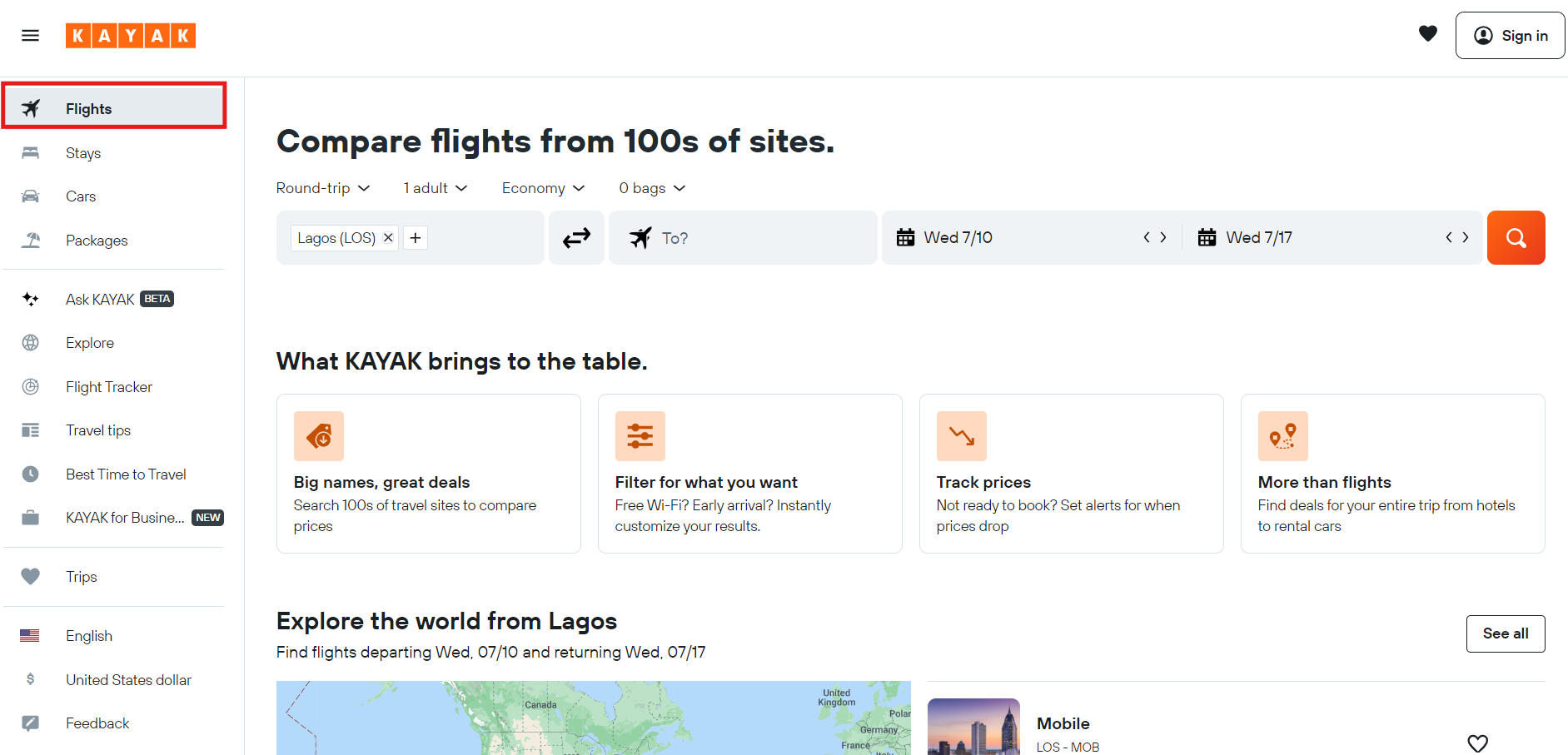 Step 1: Visit the Kayak's website and click on the Flights tab on the homepage if it is not already selected.