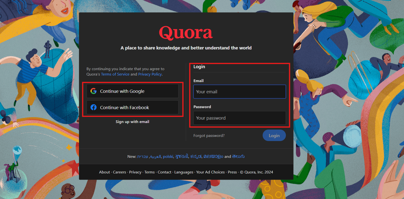 - Step 1: Open your web browser and go to Quora. Click on the "Log In" button at the top right corner of the homepage and enter your email and password, or use your Facebook or Google account to log in.