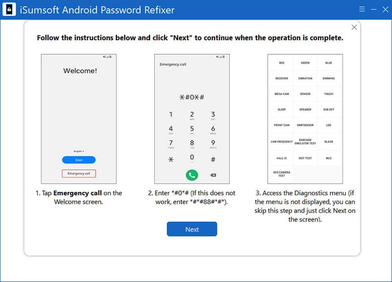 - Step 7: Follow the on-screen instructions to bring up the diagnostic menu on your phone. You’ll need to dial *#0*# or *#*#88#*#* through the Emergency Call screen to open it. Once done, click Next, and the software will send a USB debugging authorization prompt to your phone.