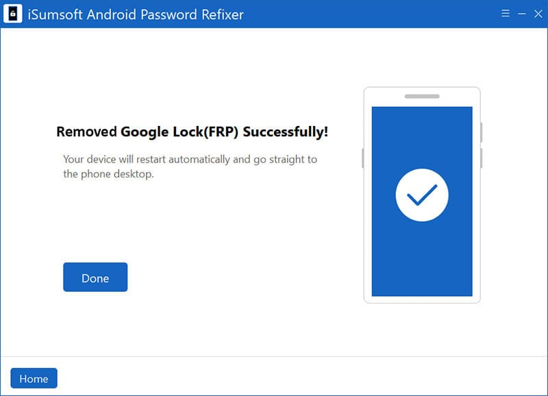 - Step 10: Once the software removes the FRP lock, your phone will reboot and go directly to the home screen, bypassing the Google account sign-in or verification.