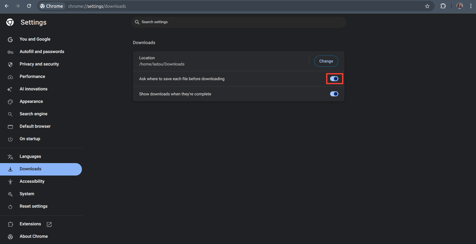 - If you'd rather choose a specific location for each download, turn on Ask where to save each file before downloading.