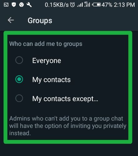 By choosing the "My Contacts" option, only individuals who are already in your phone's contacts can add you to groups without seeking your permission.