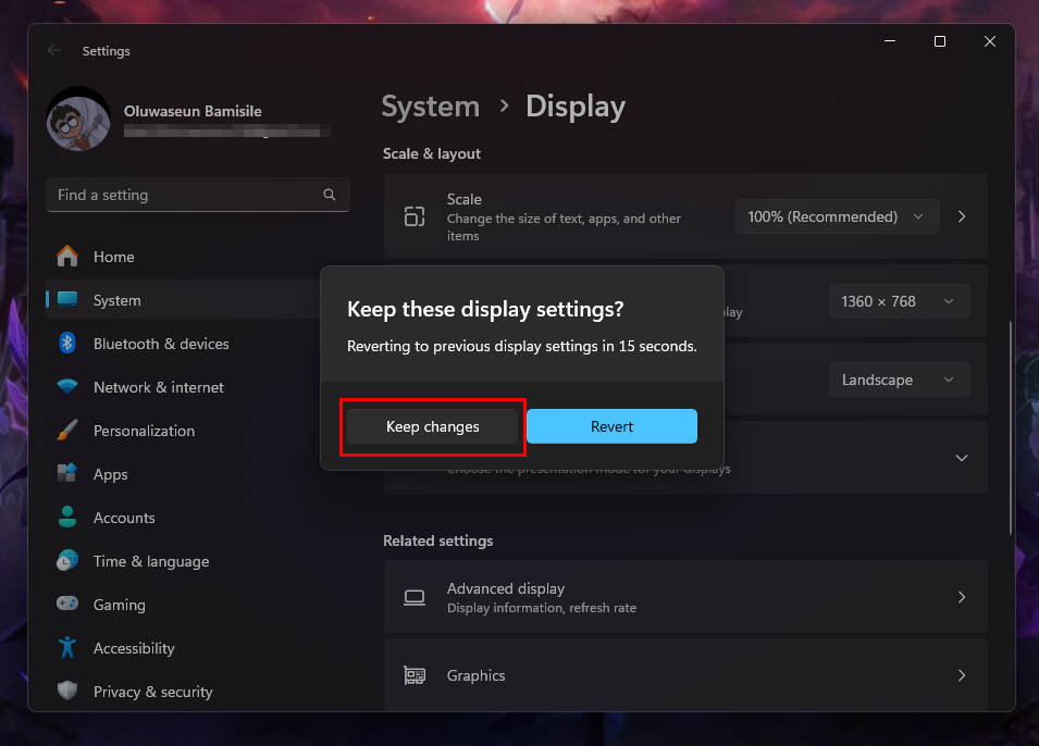 Step 4: Following that, you should receive a prompt asking if you want to keep the display settings. Select "Keep changes"