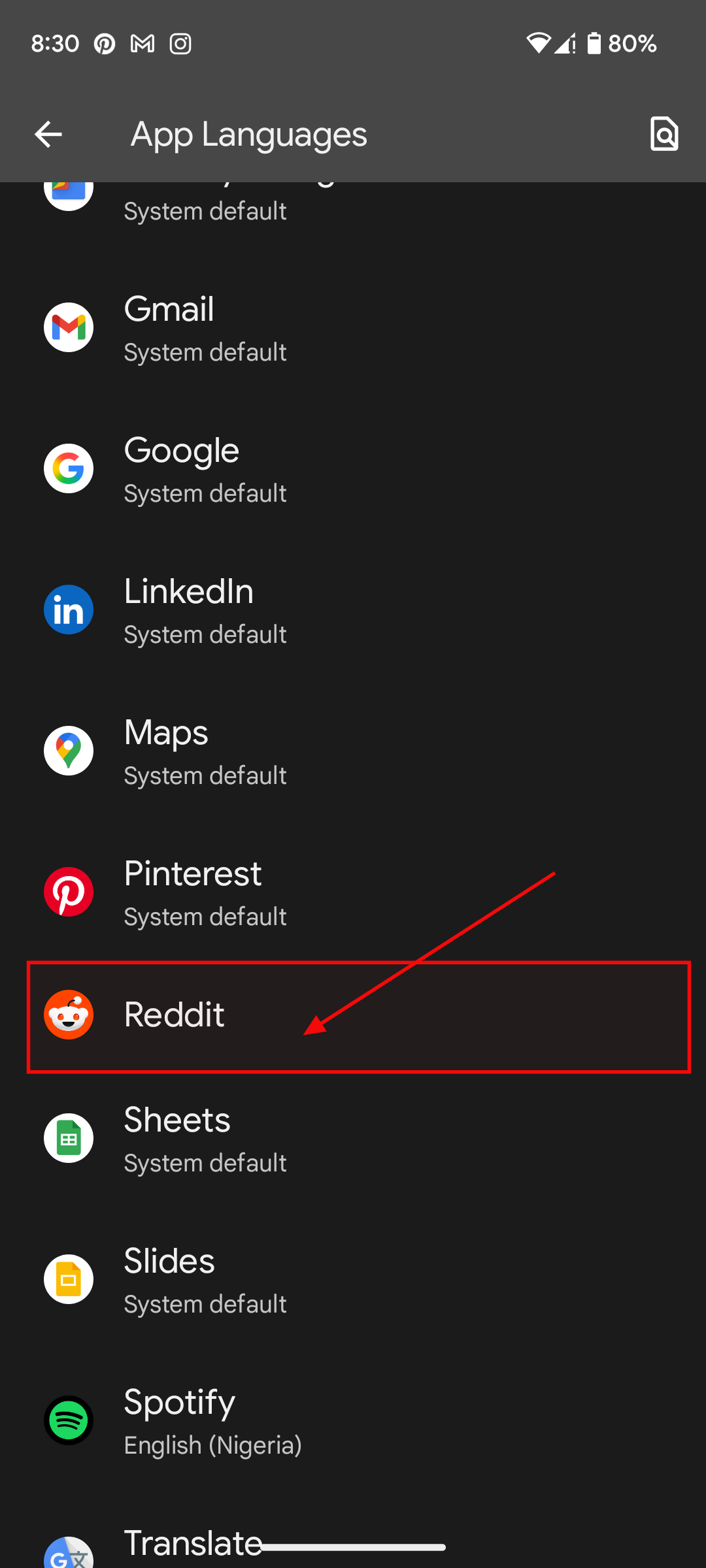 Step 5: Choose the specific app you want to change the language for, then click on it and select the Language you want (E.g. I want to change the app language on my Reddit from English to Spanish)