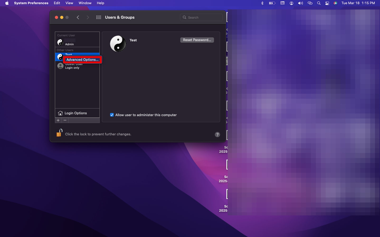 Step 4: Right-click (or Control-click) the account that you're renaming. Choose Advanced Options from the menu that appears