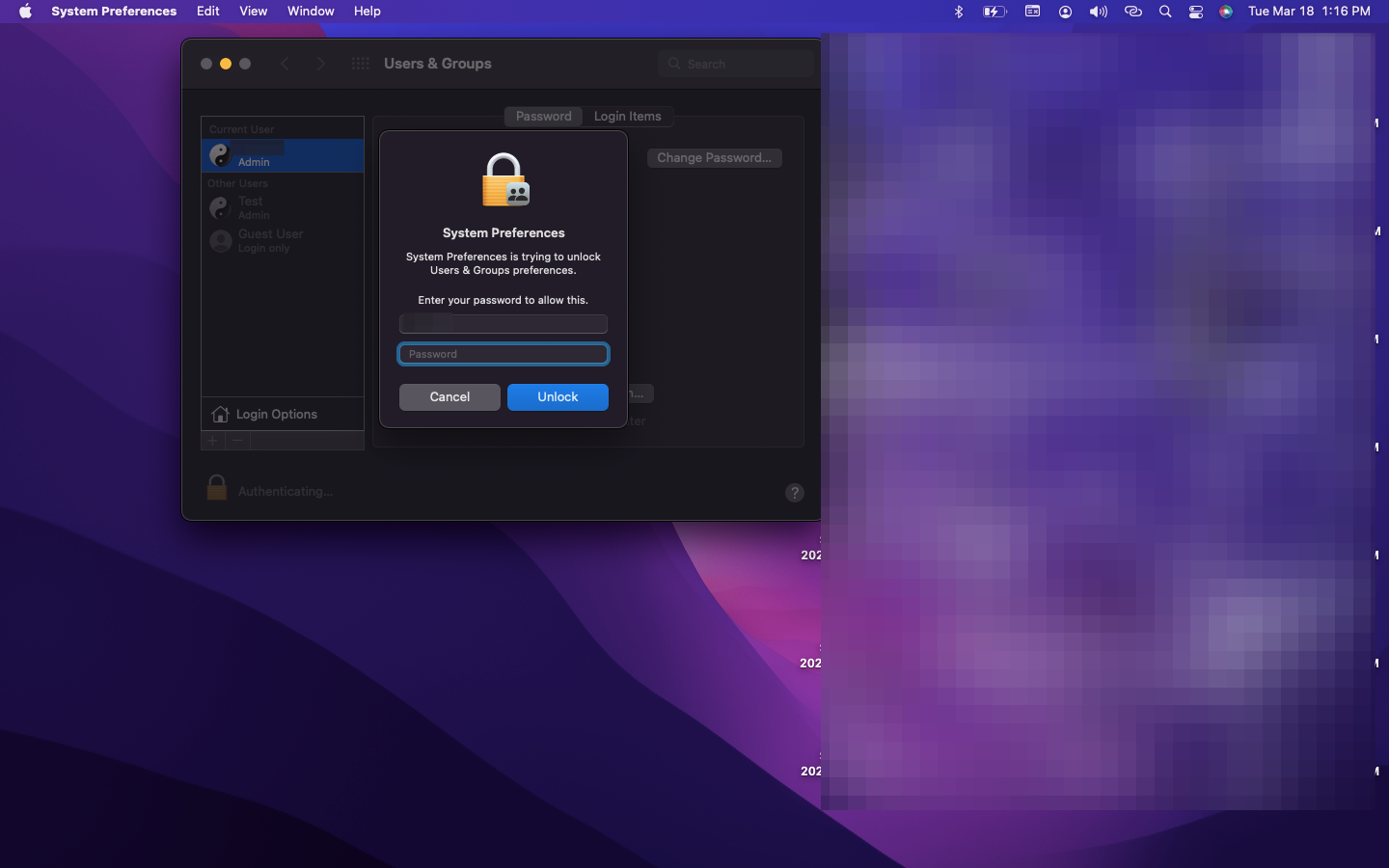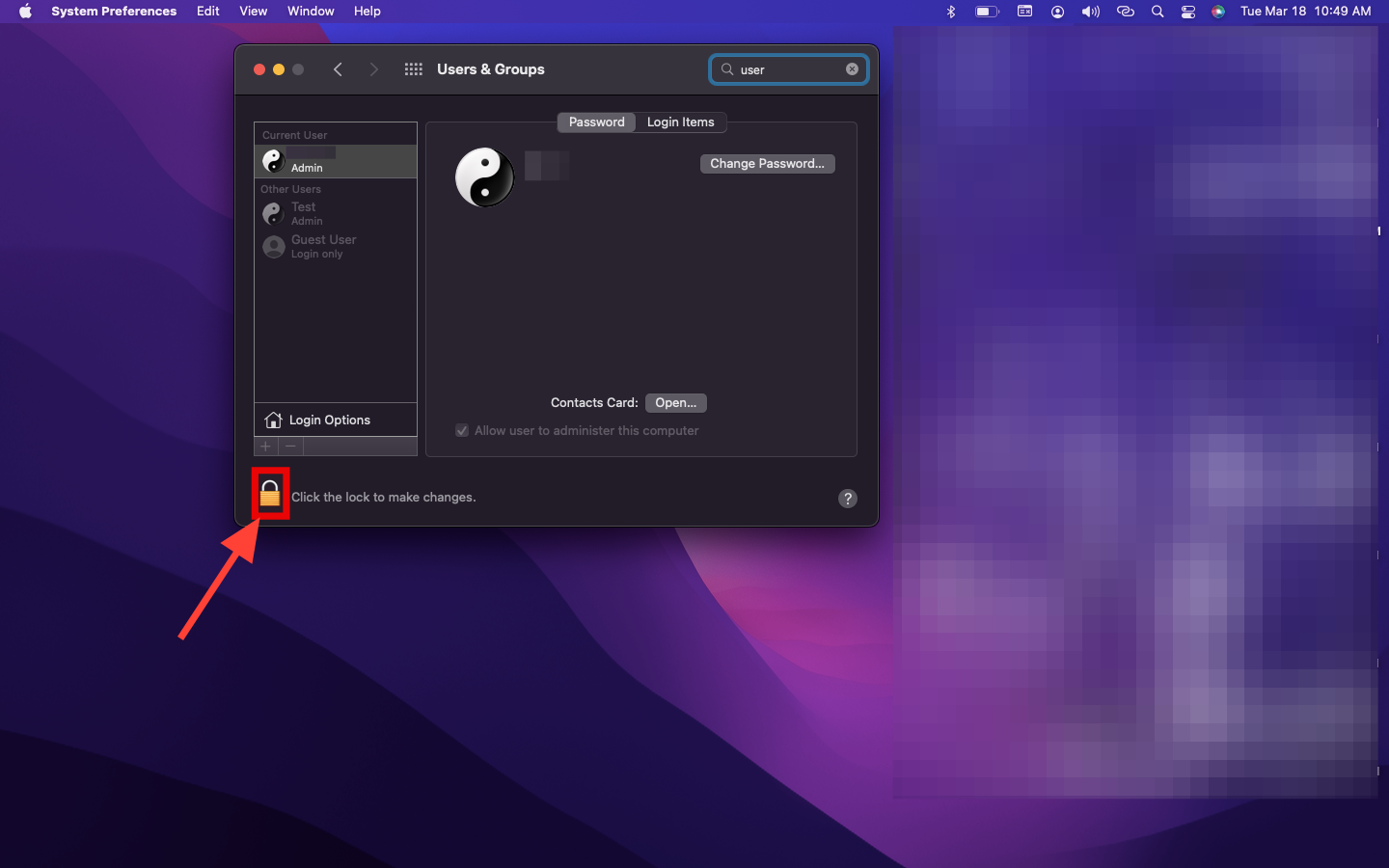 Step 3: Click the Lock, then enter the password of the new administrator account