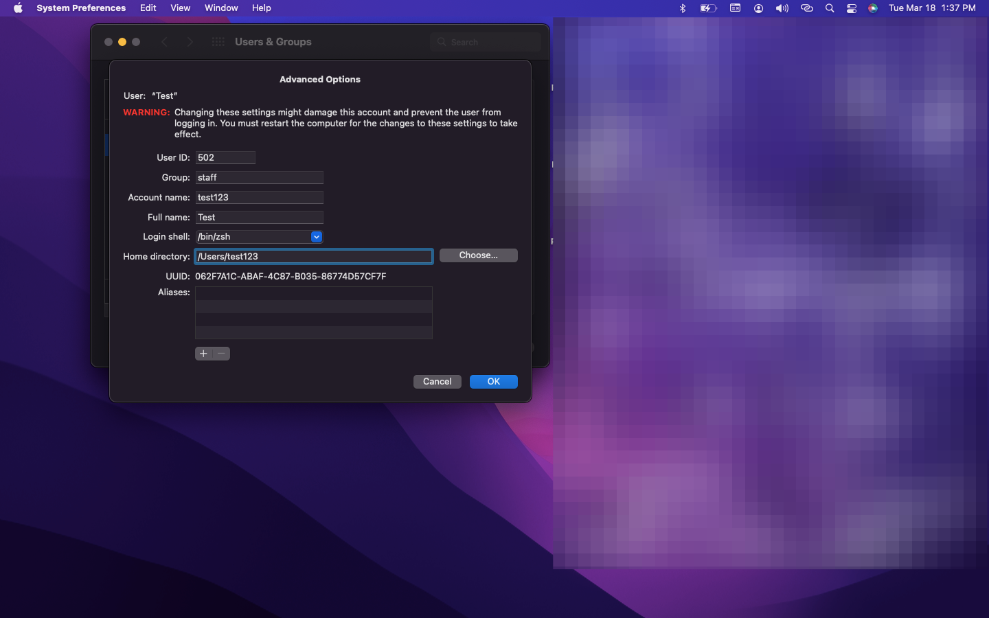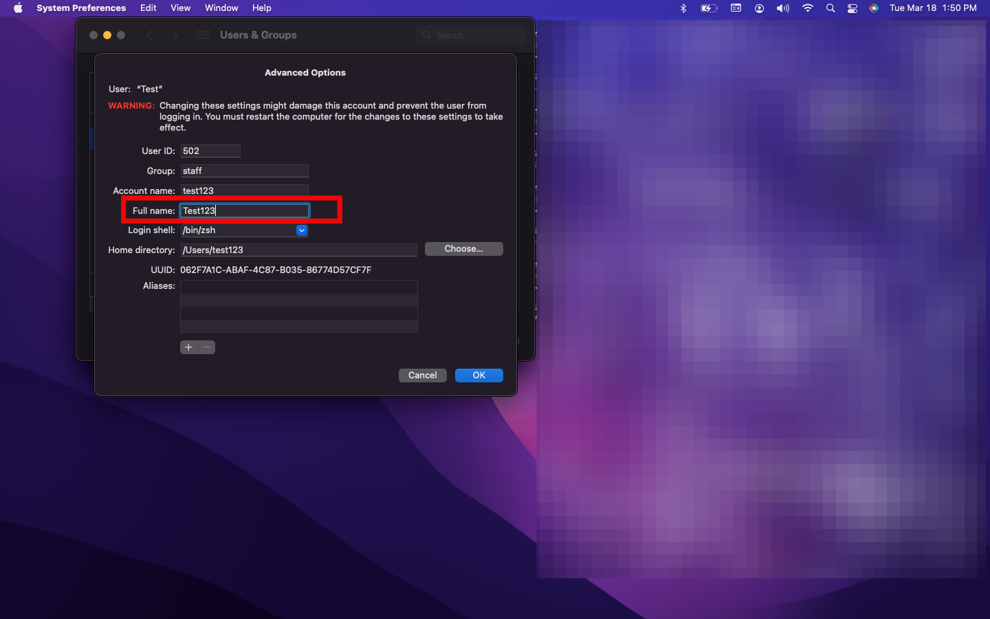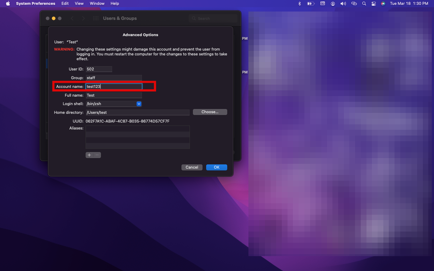 Step 5: Update the Account name field to match the new name you gave to your home folder in the previous section (e.g. test123)