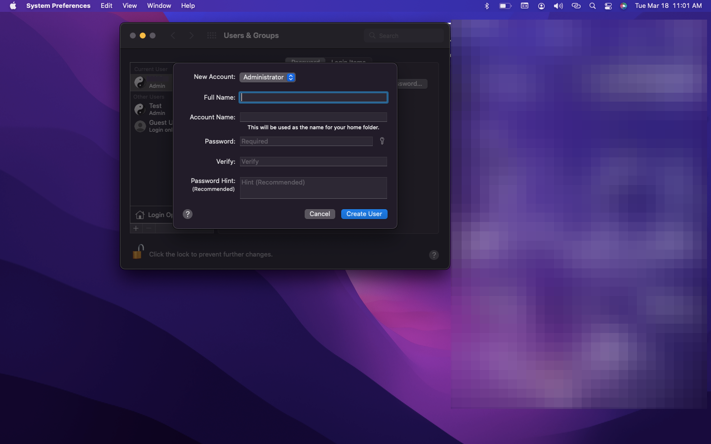 To change the name of your user account, you need to be logged into a different administrator account. If your Mac doesn't have another administrator account, you'll need to create a new one in the Users & Groups settings first: